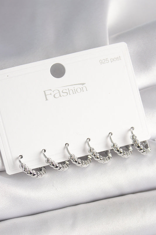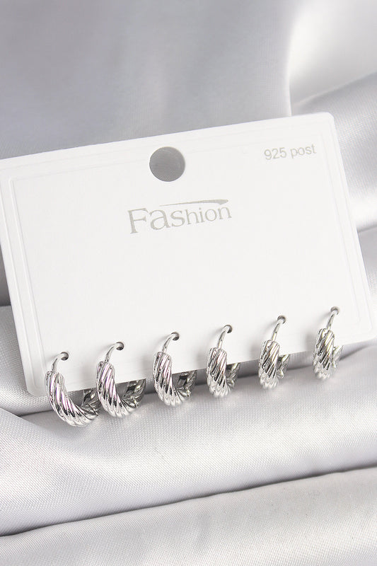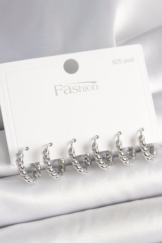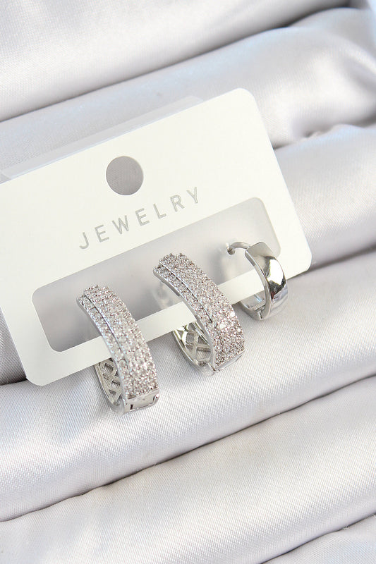 BKP10793 - Pirinç Zirkon Taşlı Halka Model Gümüş Renk 3'lü Çift Kadın Küpe Set