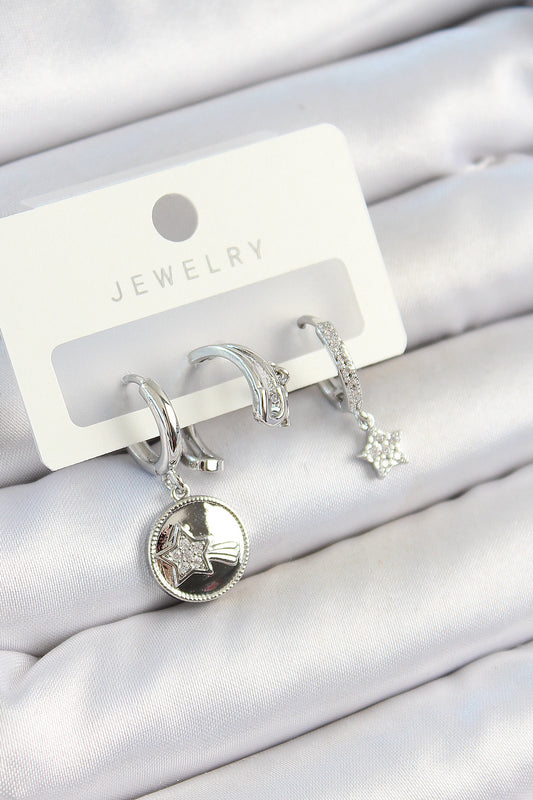 BKP10803 - Pirinç Zirkon Taşlı Kutup Yıldızı Model Gümüş Renk 3'lü Çift Kadın Küpe Set