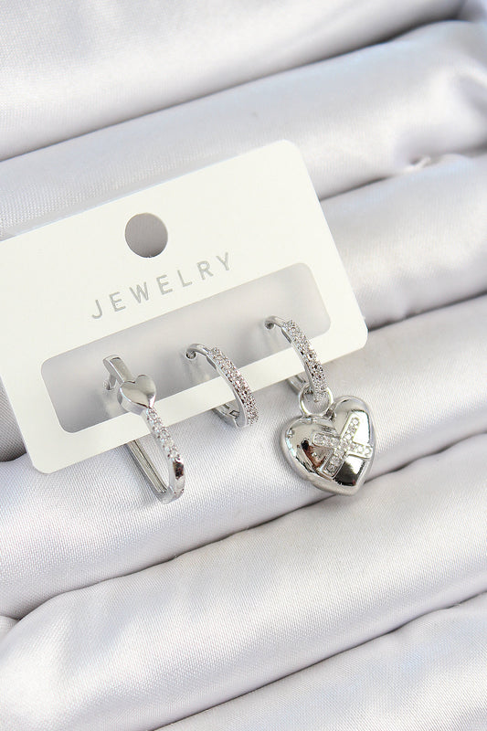 BKP10801 - Pirinç Zirkon Taşlı Kalp Model Gümüş Renk 3'lü Çift Kadın Küpe Set