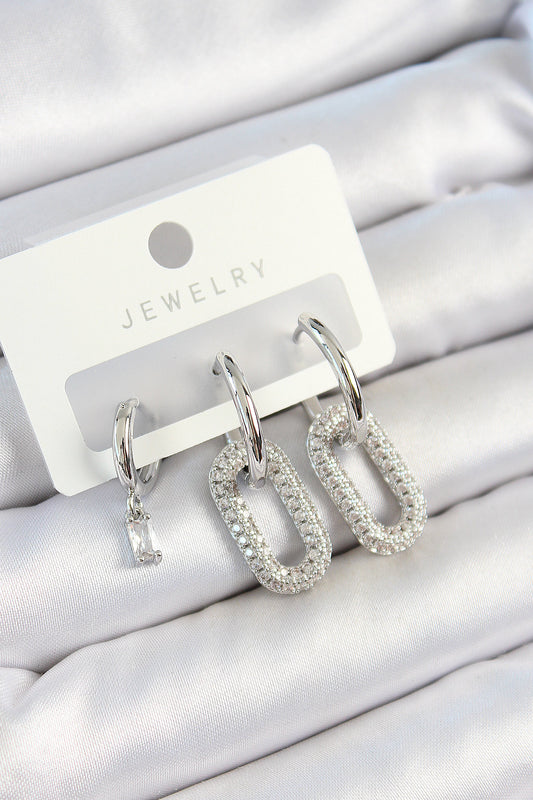 BKP10789 - Pirinç Zirkon Taşlı Sallantılı Model Gümüş Renk 3'lü Çift Kadın Küpe Set