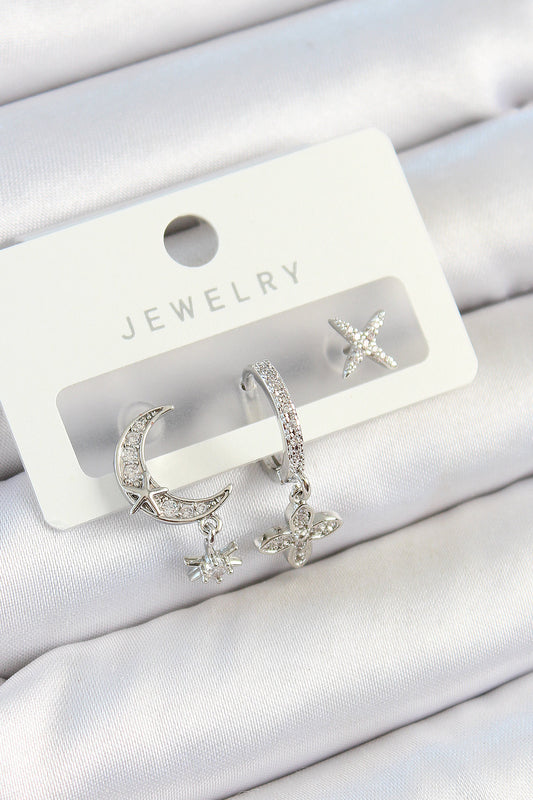 BKP10804 - Pirinç Zirkon Taşlı Çiçek Ve Ay Model Gümüş Renk 3'lü Çift Kadın Küpe Set