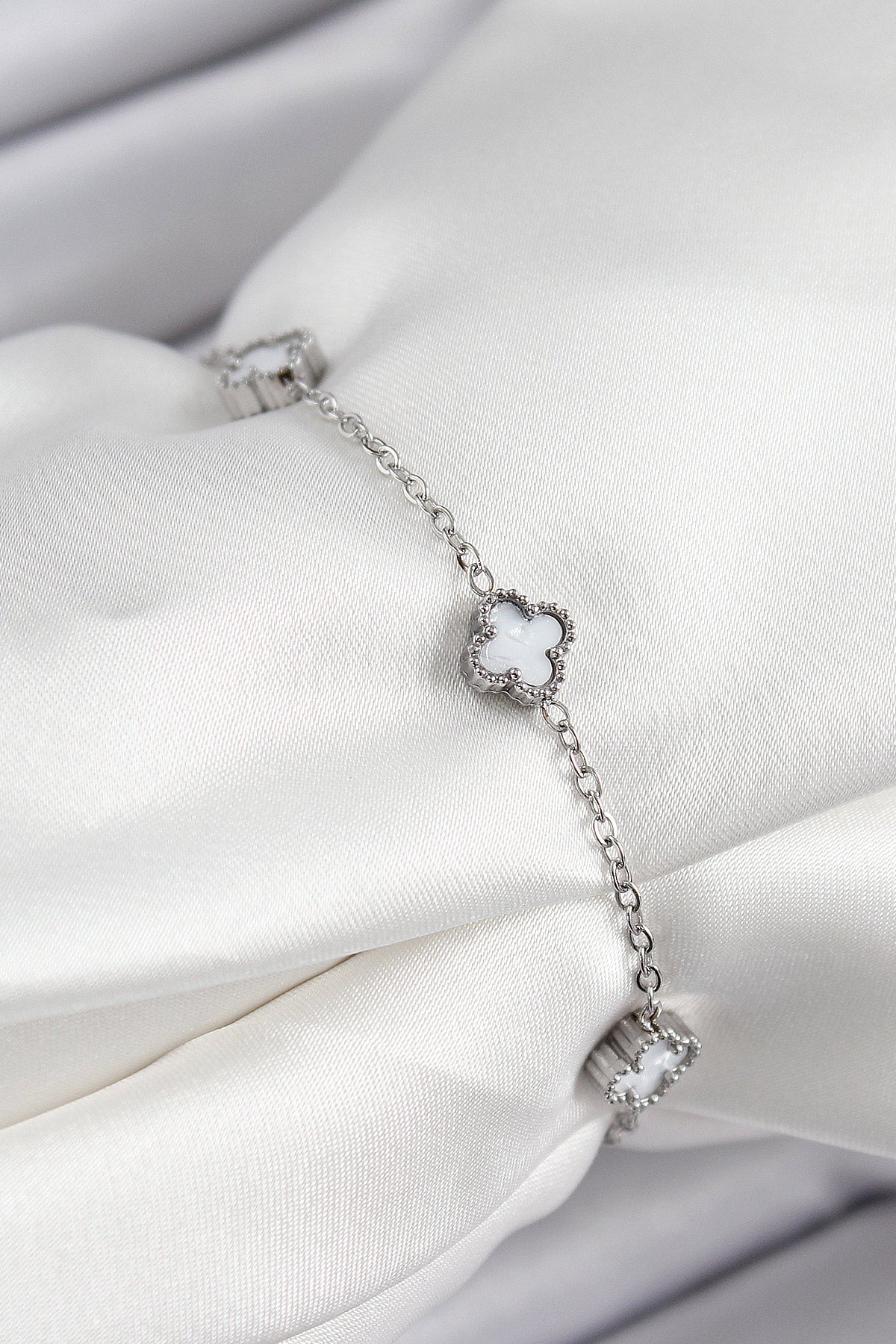 316L Çelik Beyaz Sedef Yonca Model Gümüş Renk Kadın Bileklik - BB7361