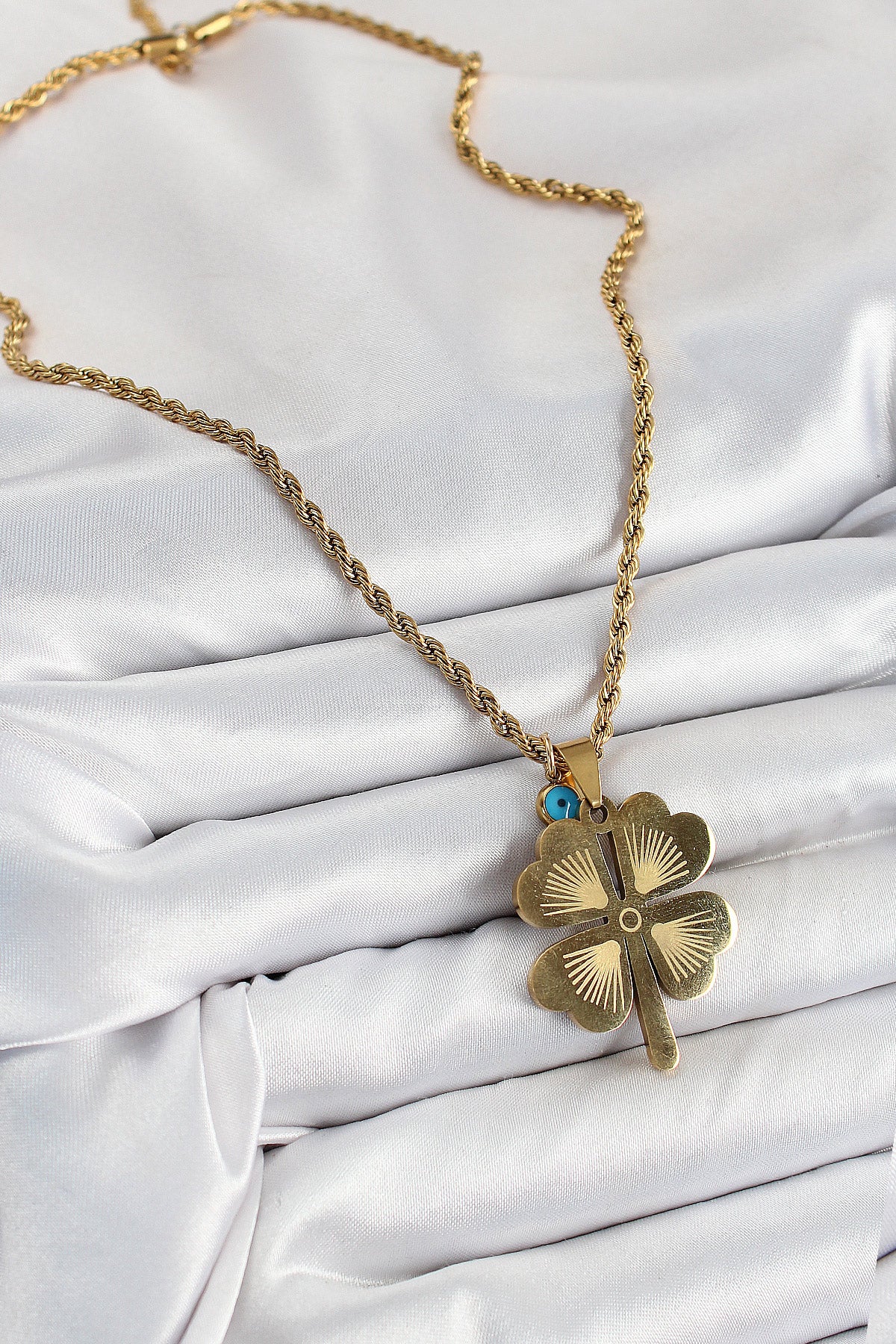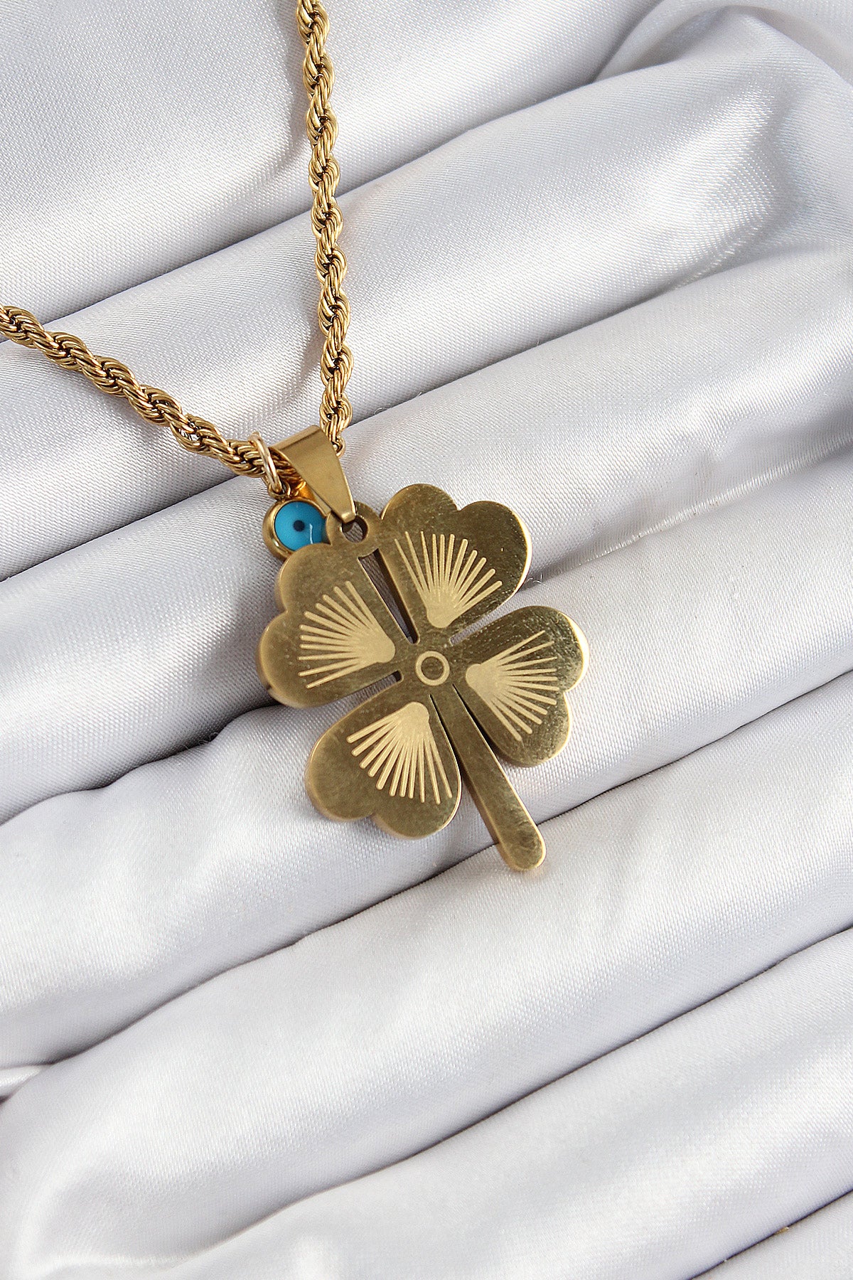 316L Çelik Burgu Zincirli Nazar Detaylı Yonca Model Gold Renk Kadın Kolye - BKO10377