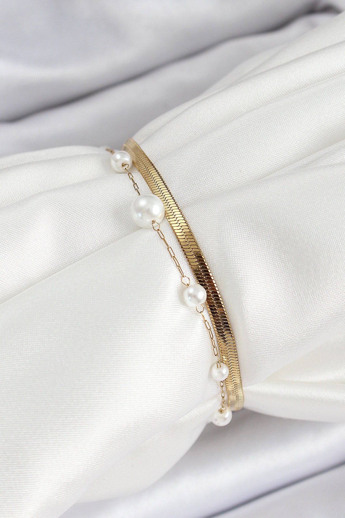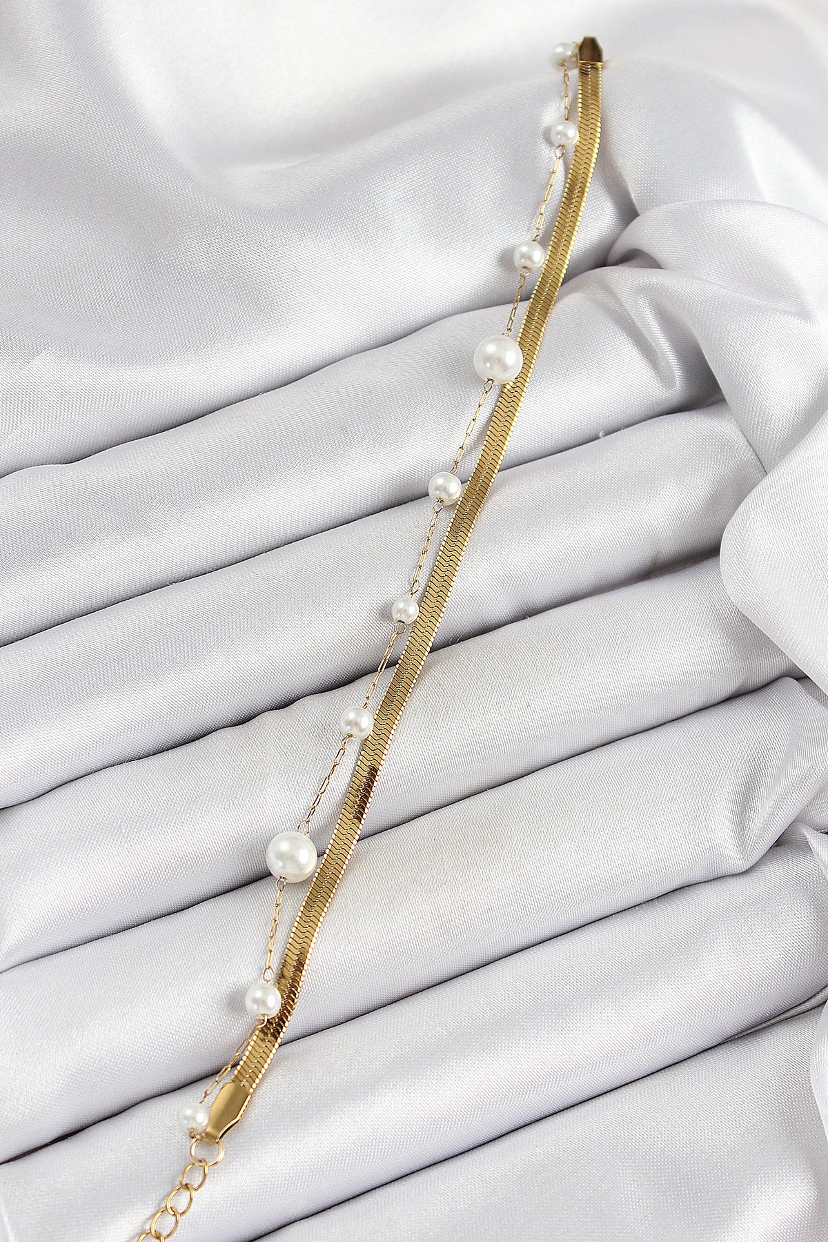 316L Çelik Gold Renk İncili ve İtalyan Zincirli Kadın Bileklik - BB7094