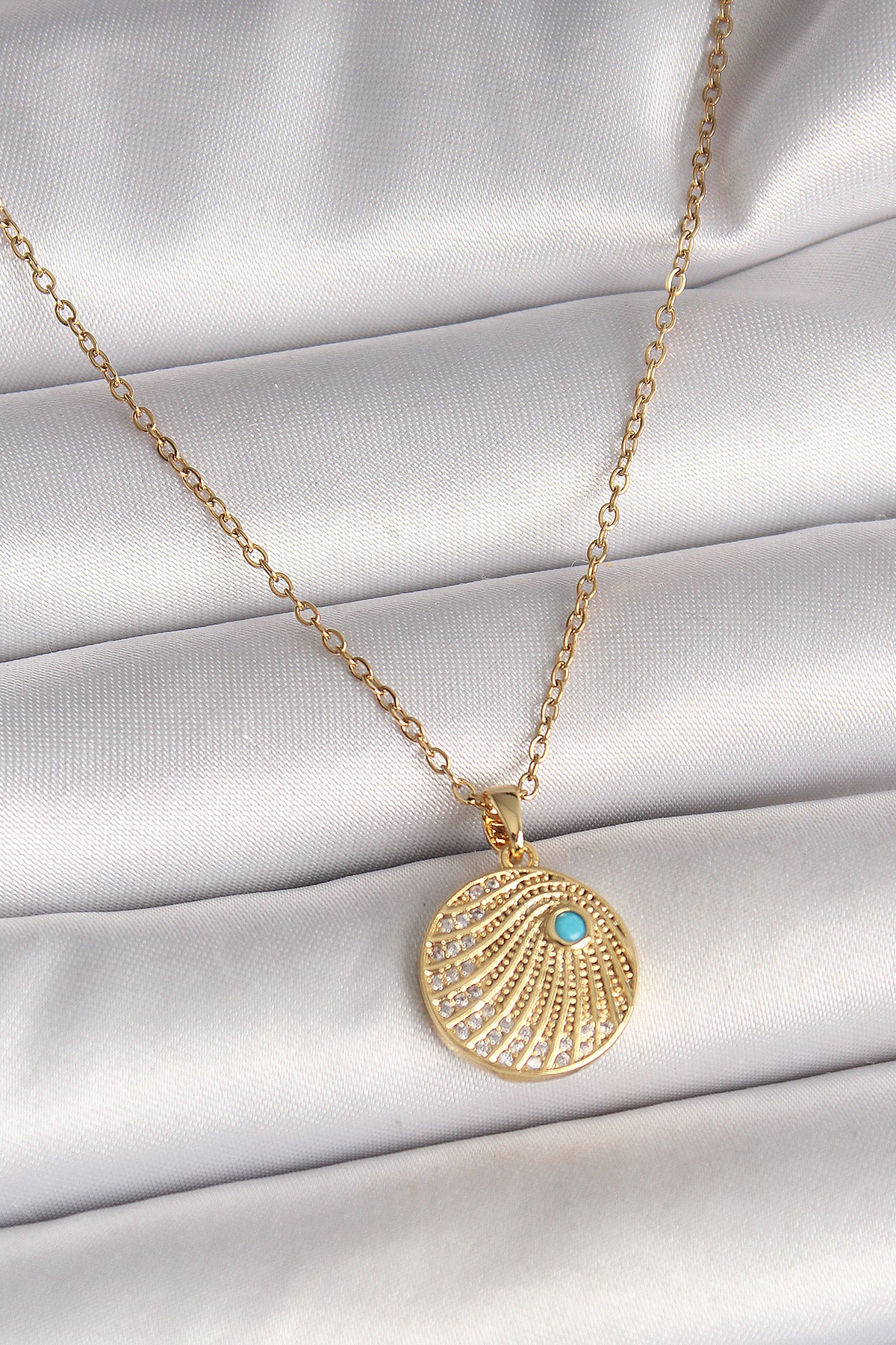316L Çelik Gold Renk Zincir Zirkon Taş İşlemeli Mavi Taş Detaylı Madalyon Model Kadın Kolye - BKO9964