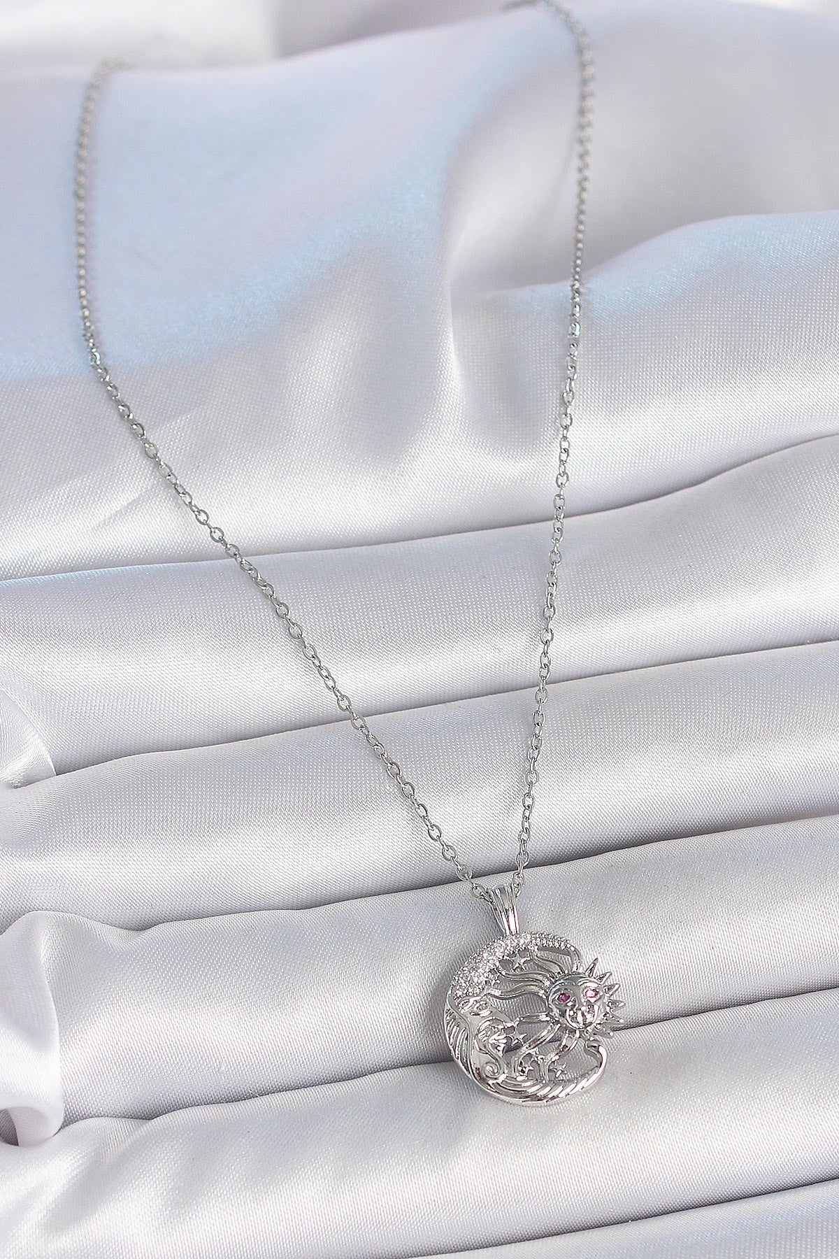 316L Çelik Gümüş Renk Zincir Ay Güneş Model Zirkon Taş Detay Kadın Kolye - BKO10056