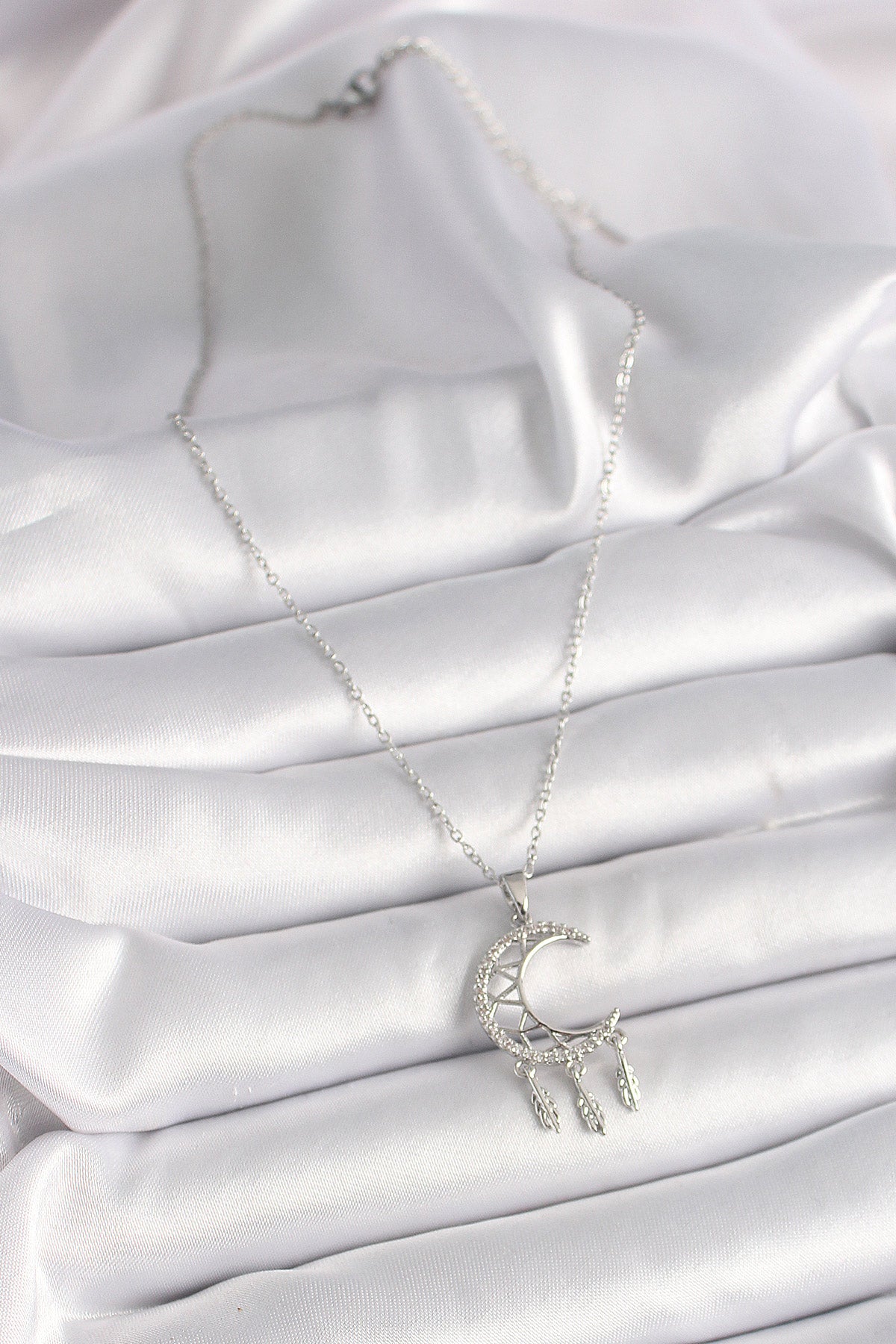 316L Çelik Gümüş Renk Zincir Zirkon Taşlı Hilal Model Sallantı Yaprak Detay Kadın Kolye - BKO9651