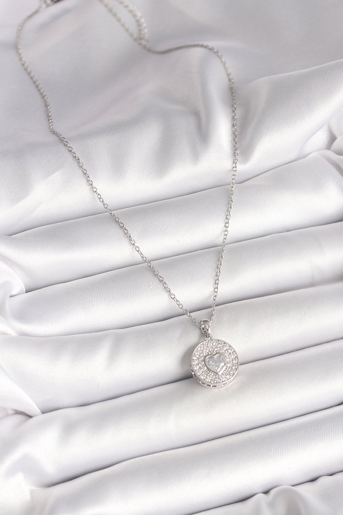 316L Çelik Gümüş Renk Zincir Zirkon Taşlı Kalp İşlemeli Madalyon Model Kadın Kolye
