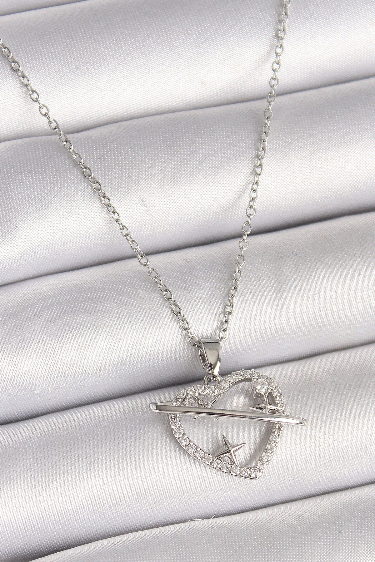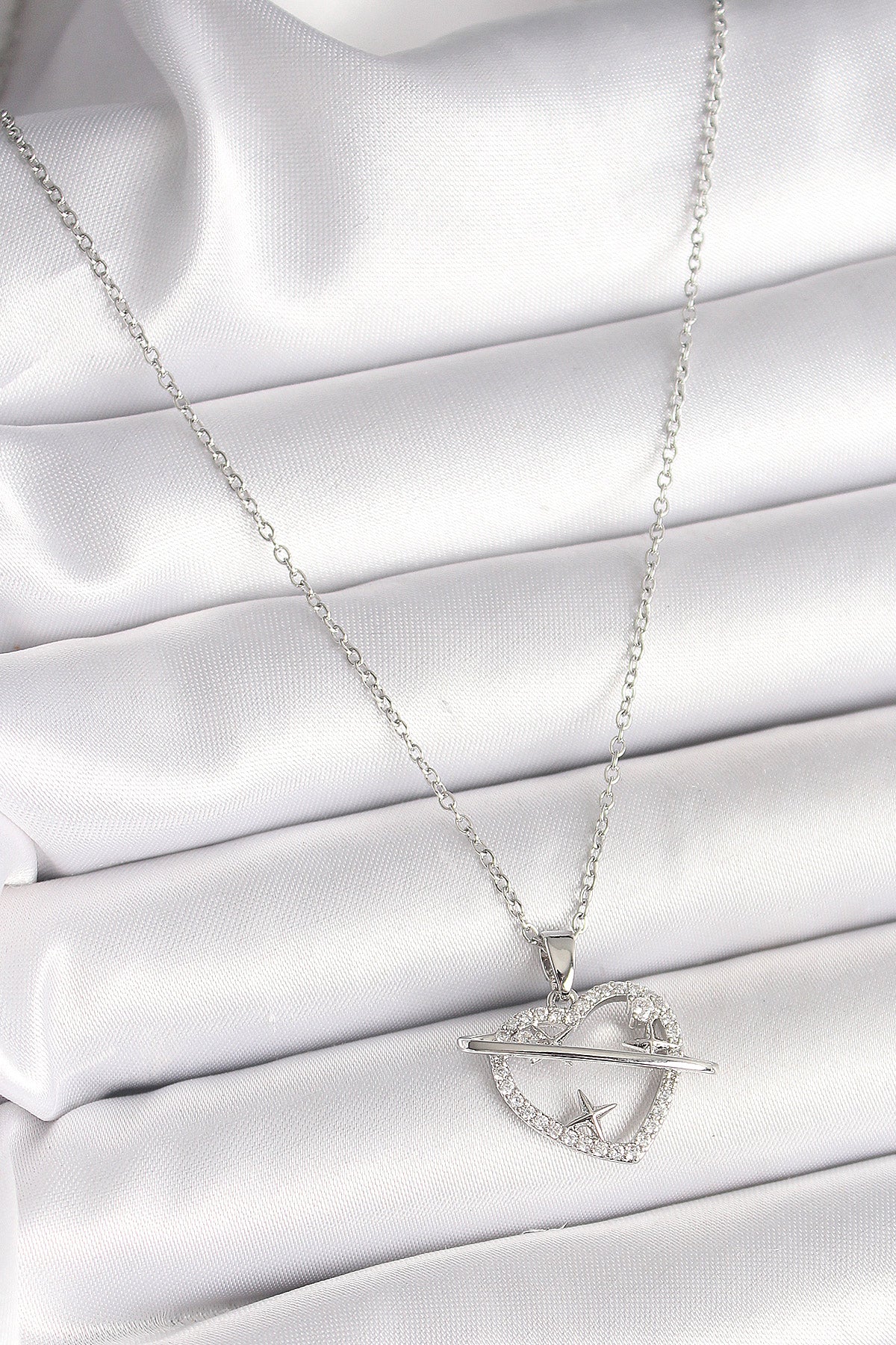 316L Çelik Gümüş Renk Zincir Zirkon Taşlı Kalp Model Yıldız Detay Kadın Kolye - BKO9860