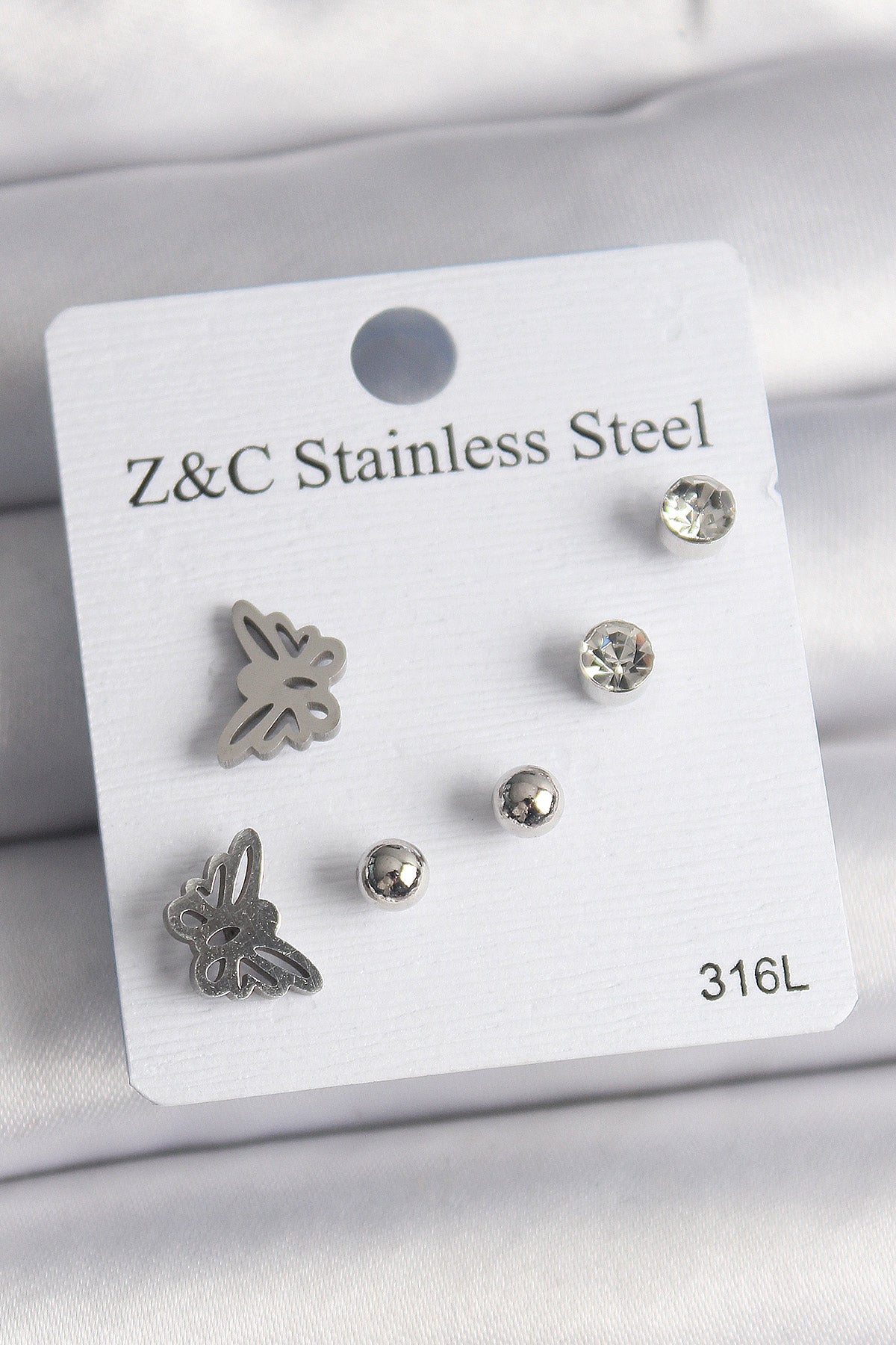 316L Çelik Gümüş Renk Zirkon Taşlı Kelebek Model Kadın Küpe Seti - BKP10008