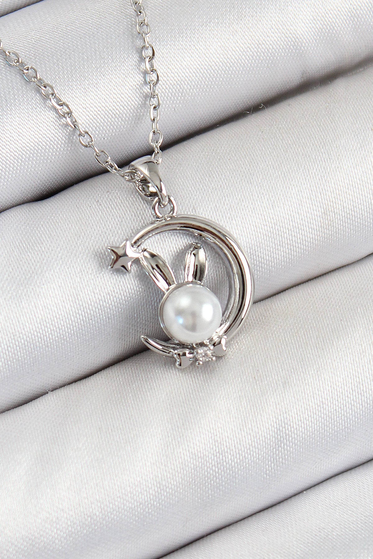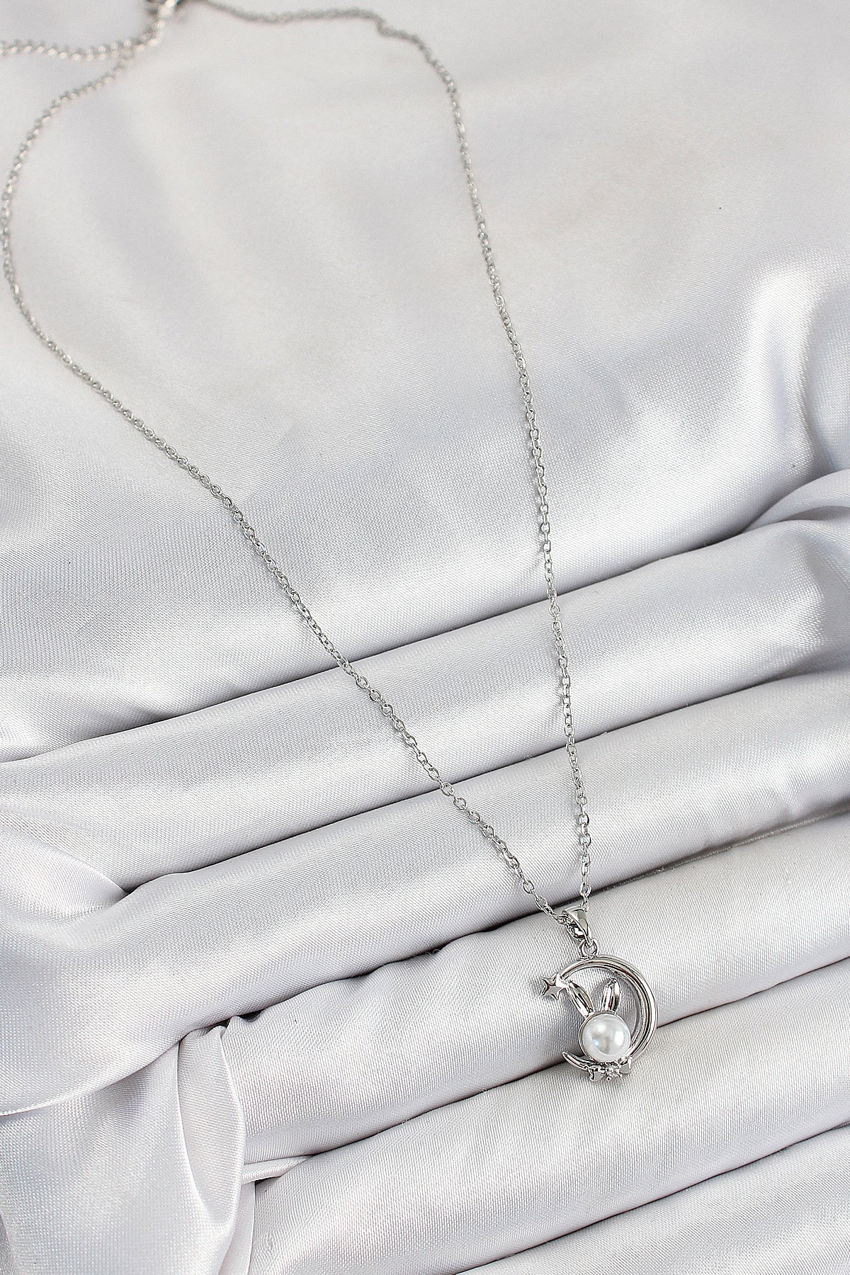 316L Çelik İnci Detaylı Hilal Tavşan Model Gümüş Renk Kadın Kolye - BKO10348