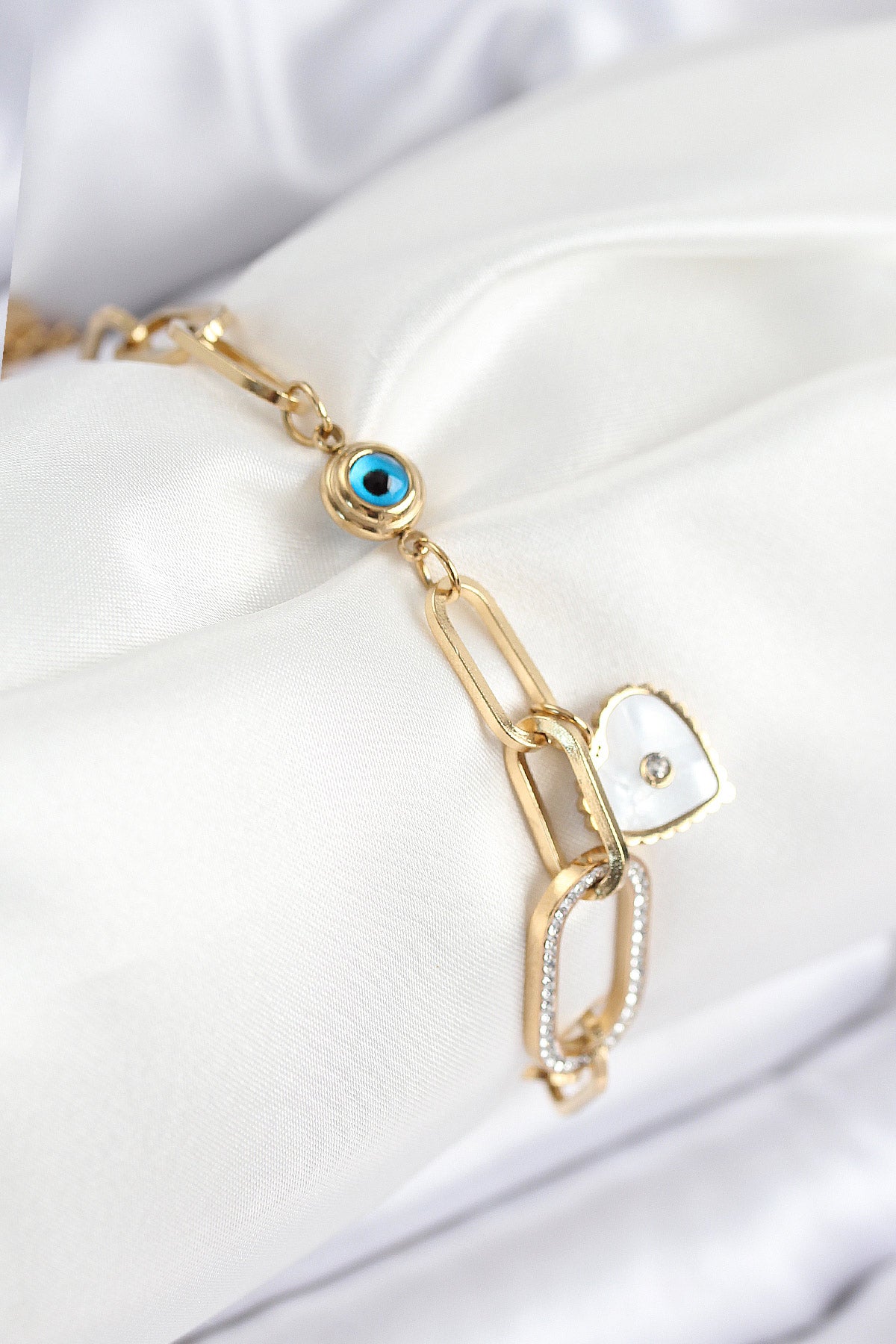 316L Çelik Nazar Boncuğu Ve Zirkon Taşlı Kalp Model Gold Renk Kadın Bileklik - BB7837