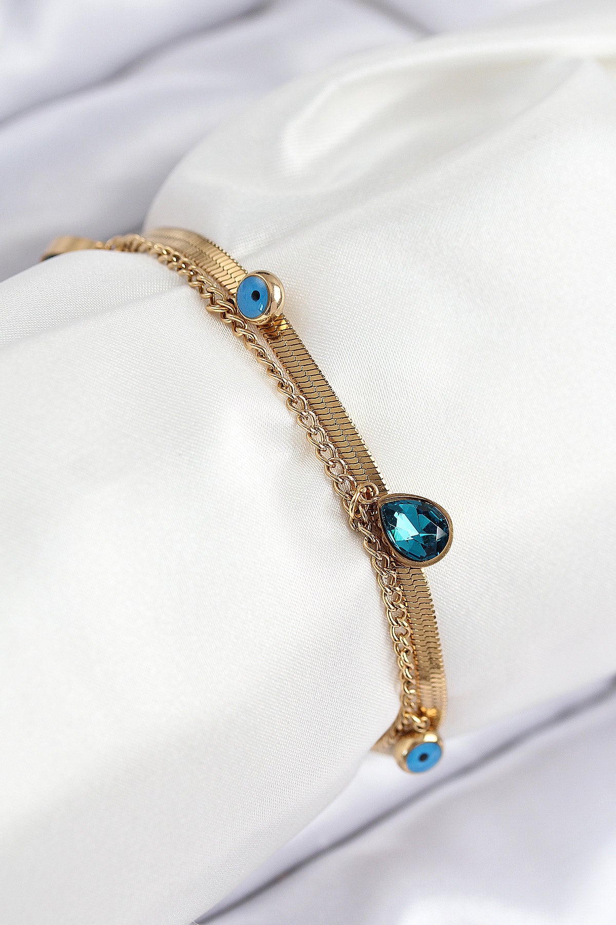 316L Çelik Nazar Boncuk Detaylı Mavi Zirkon Taşlı Model İtalyan Zincir Gold Renk Kadın Bileklik - BB7828
