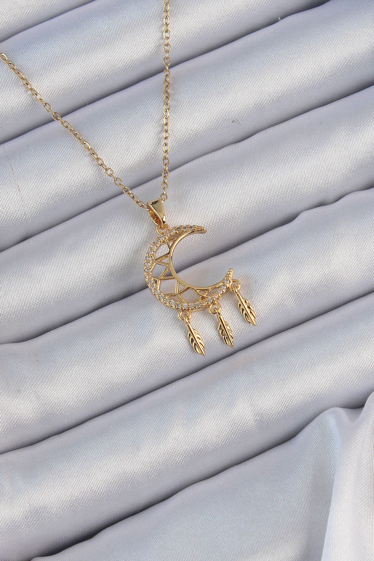 316L Çelik Zincir Altın Renk İşlemeli Zirkon Taşlı Ay Kolye - BKO9171