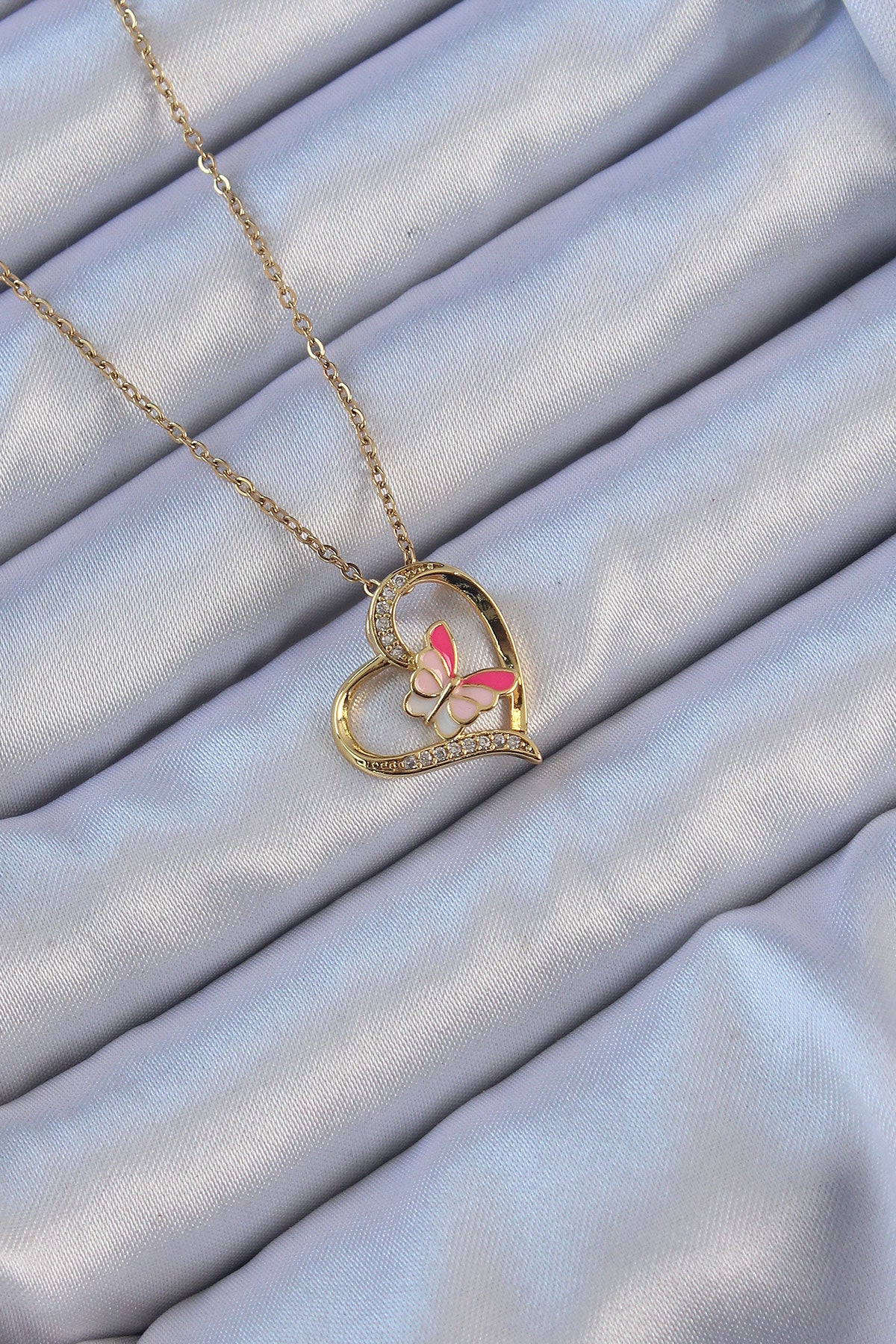 316L Çelik Zincir Altın Renk Mineli Kelebek Figür Zirkon Taşlı Kalp Kolye - BKO9107