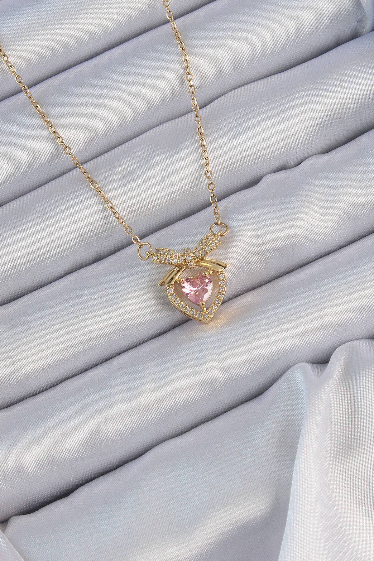 316L Çelik Zincir Altın Renk Pembe Zirkon Taşlı Fiyonklu Kalp Kolye - BKO9173