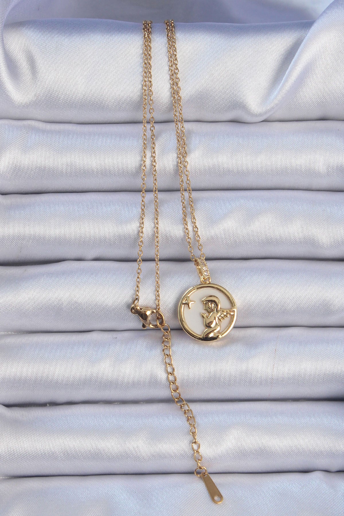316L Çelik Zincir Altın Renk Zirkon Taşlı Mineli Melek Kolye - BKO9085