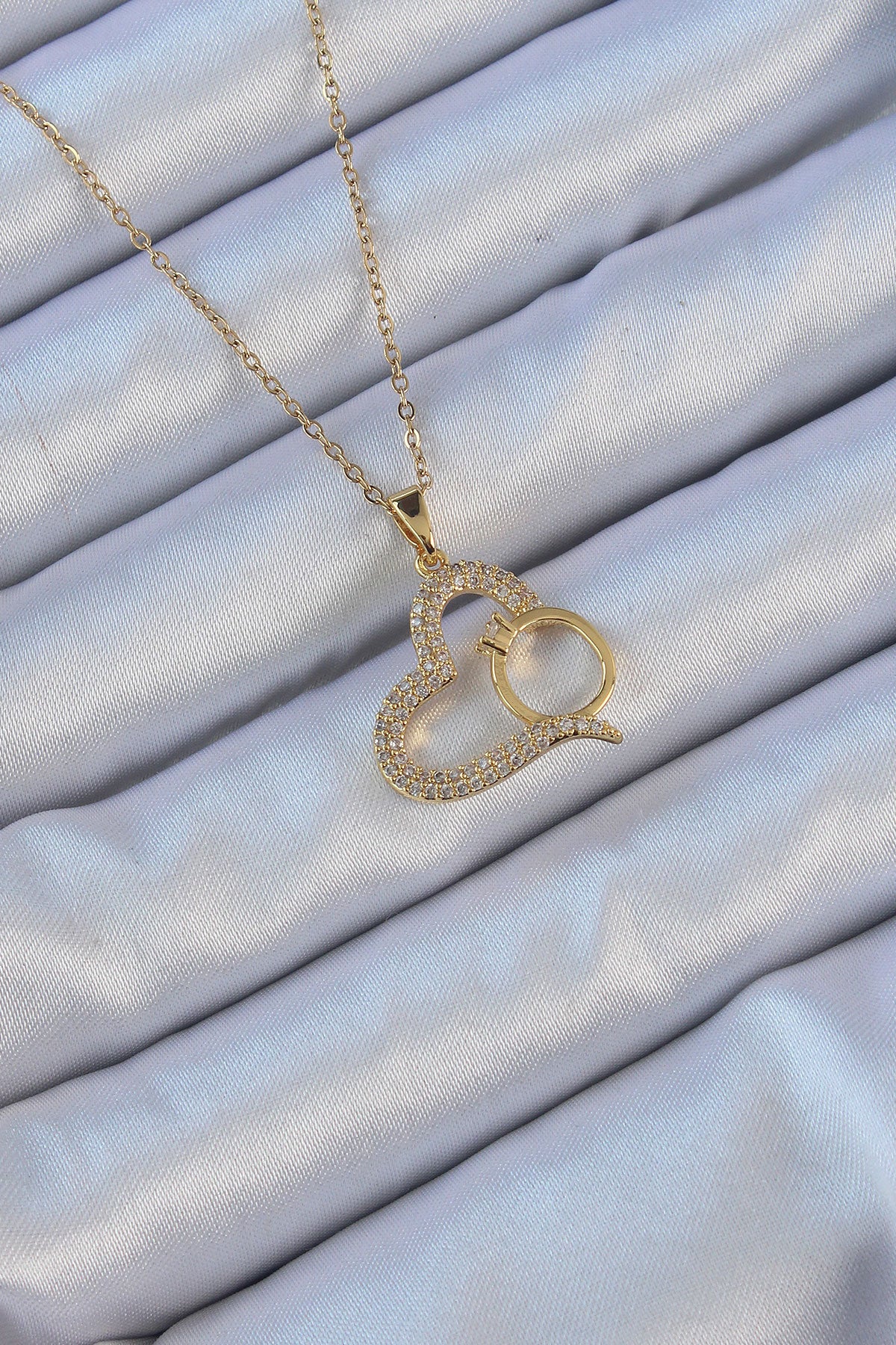 316L Çelik Zincir Altın Renk Zirkon Taşlı Yüzüklü Kalp Kolye - BKO9145