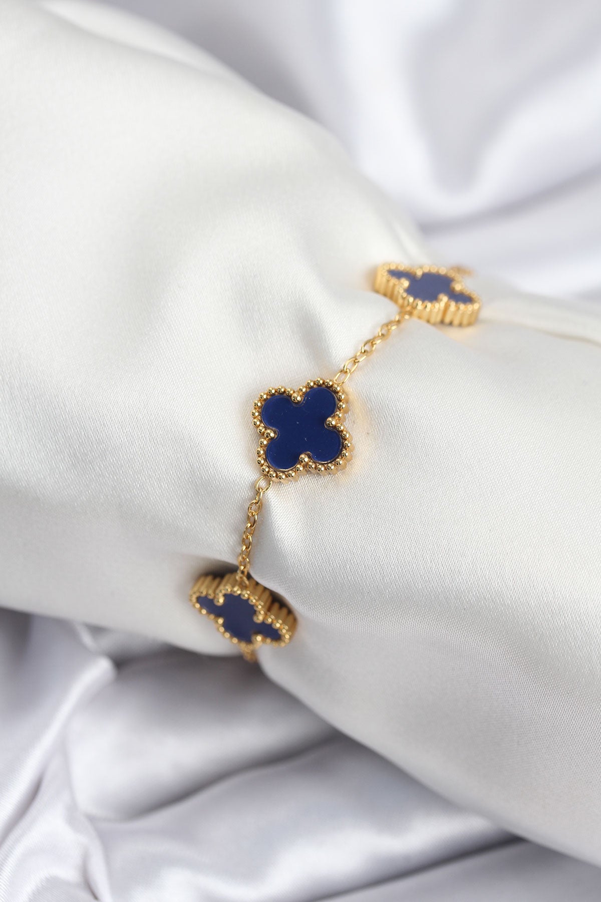 316L Çelik Zincir Gold Renk Lacivert Yonca Kadın Bileklik - BB7957