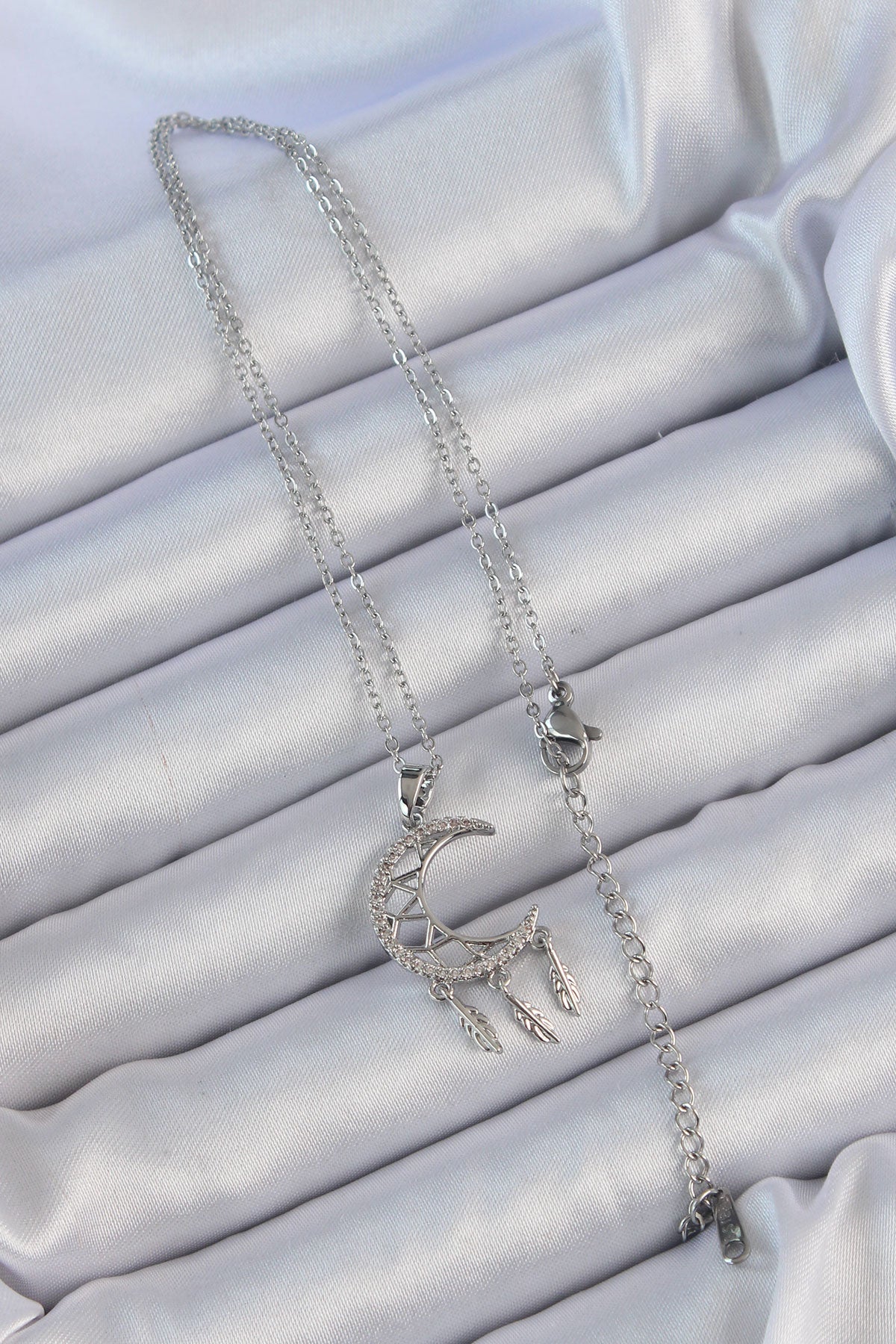 316L Çelik Zincir Gümüş Renk İşlemeli Zirkon Taşlı Ay Kolye - BKO9172