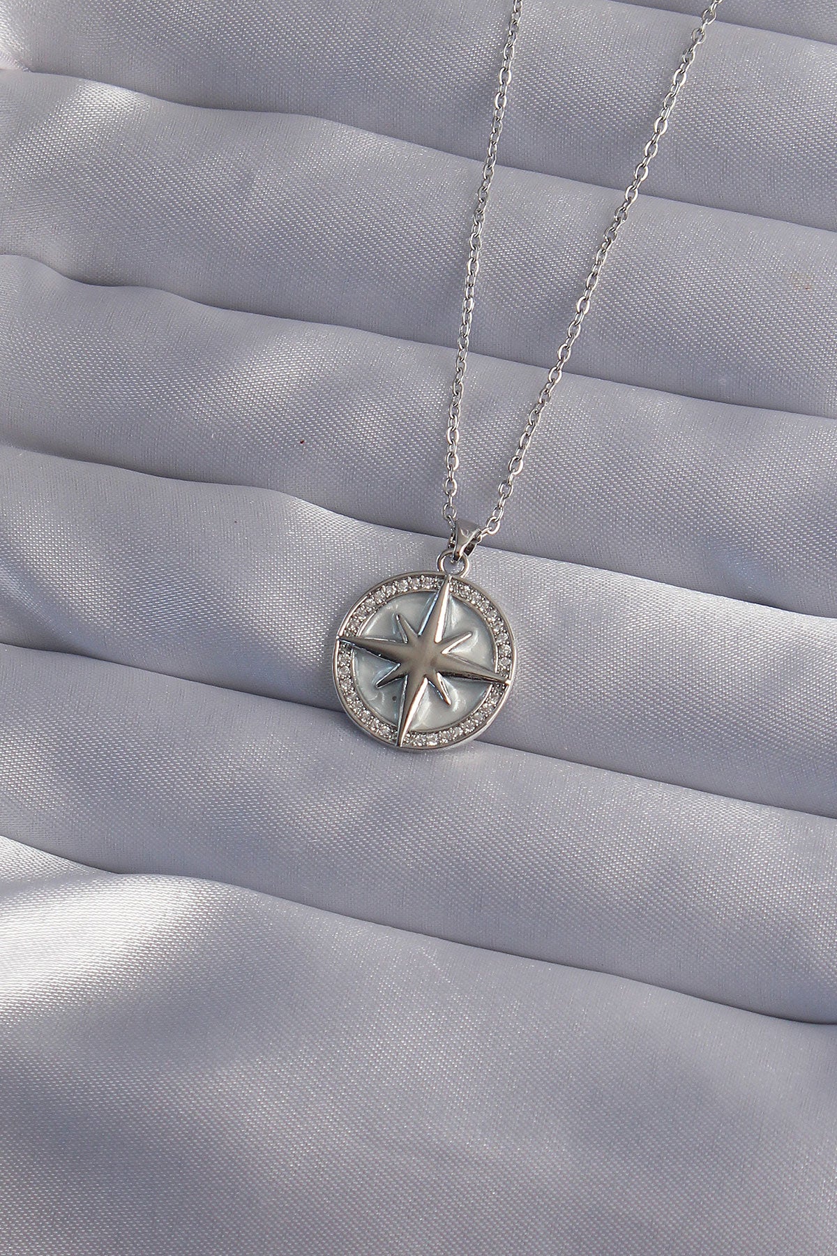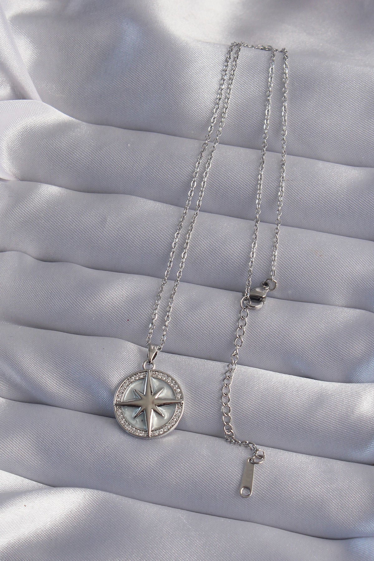 316L Çelik Zincir Gümüş Renk Zirkon Taşlı Kutup Yıldızı Kolye - BKO9012