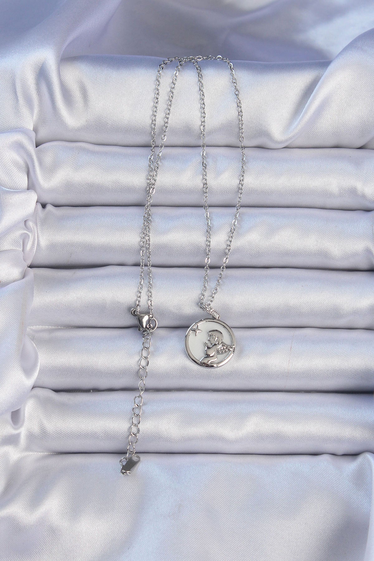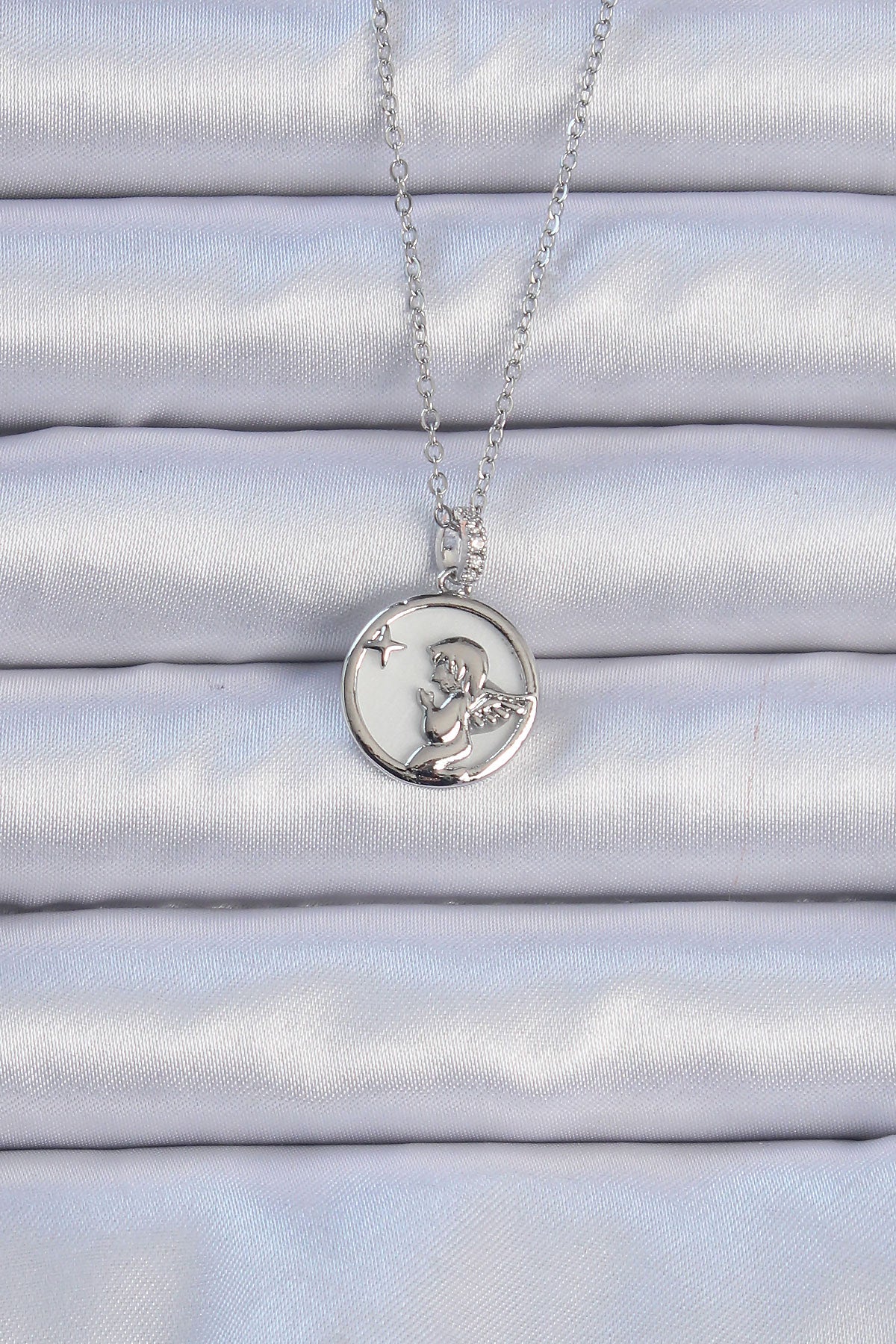 316L Çelik Zincir Gümüş Renk Zirkon Taşlı Mineli Melek Kolye - BKO9086