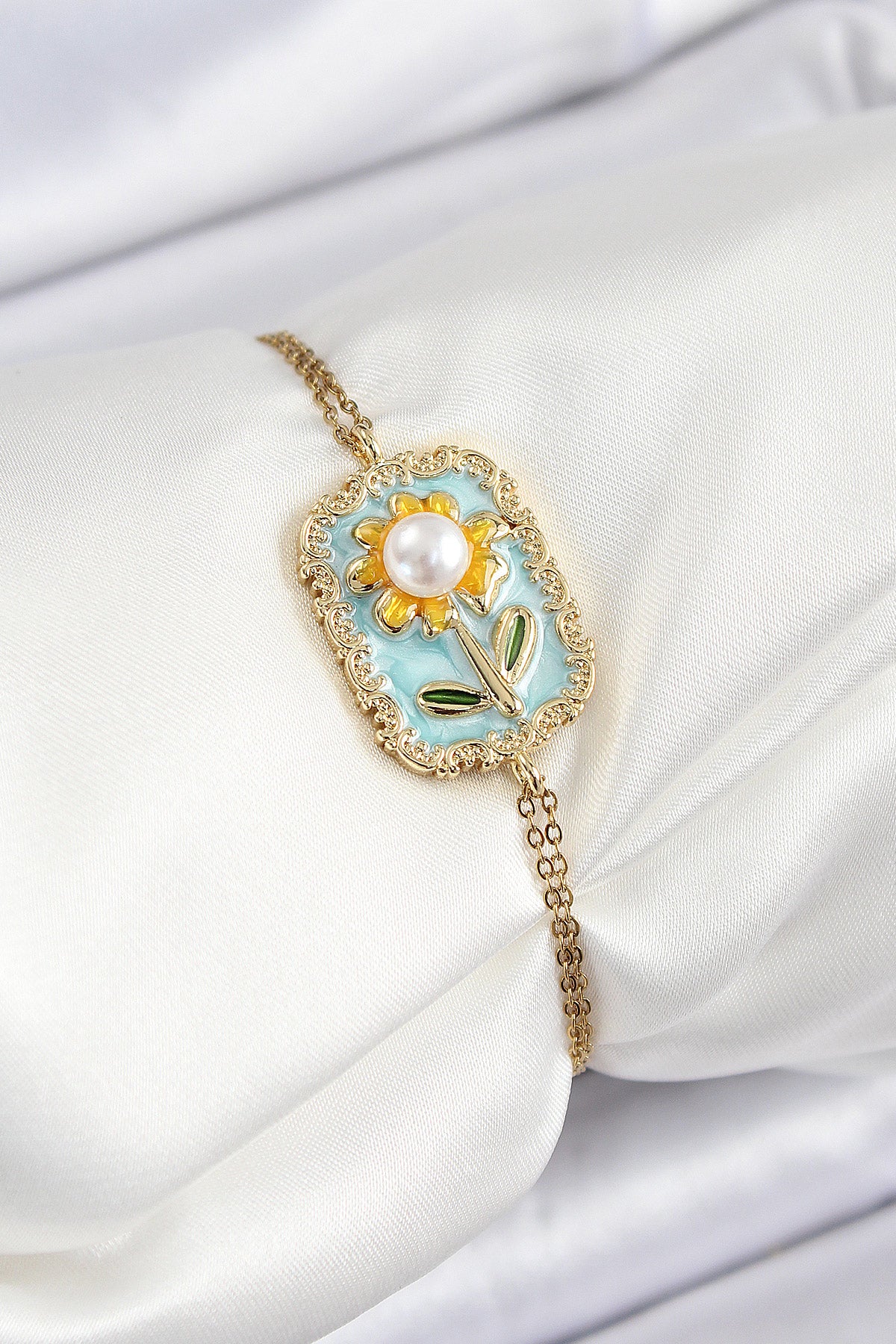 316L Çelik Zincir Turkuaz Mineli Sanatsal Portre İnci Detaylı Papatya Model Gold Renk Kadın Bileklik