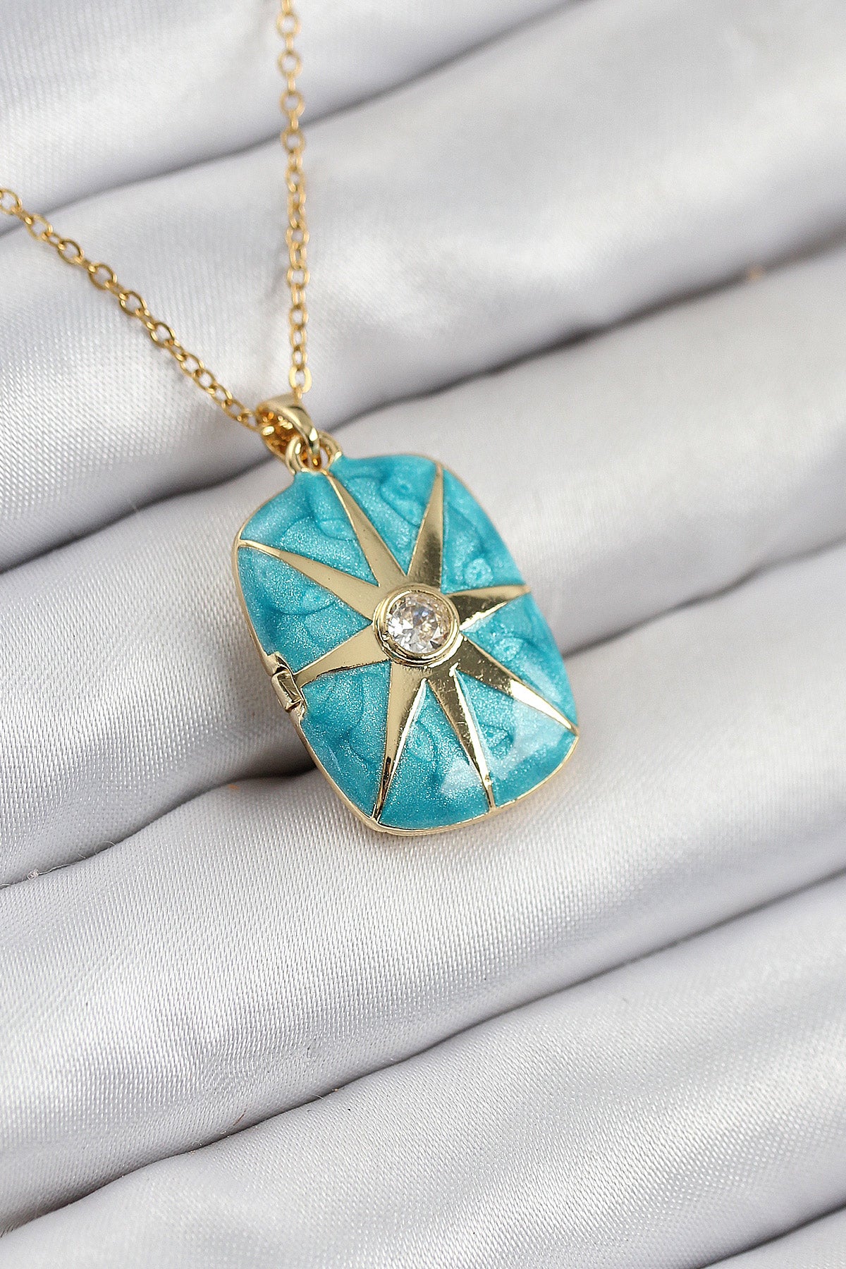 316L Çelik Zirkon Taşlı Açılabilr Kapaklı Kutup Yıldzı Model Gold Renk Kadın Kolye - BKO10517
