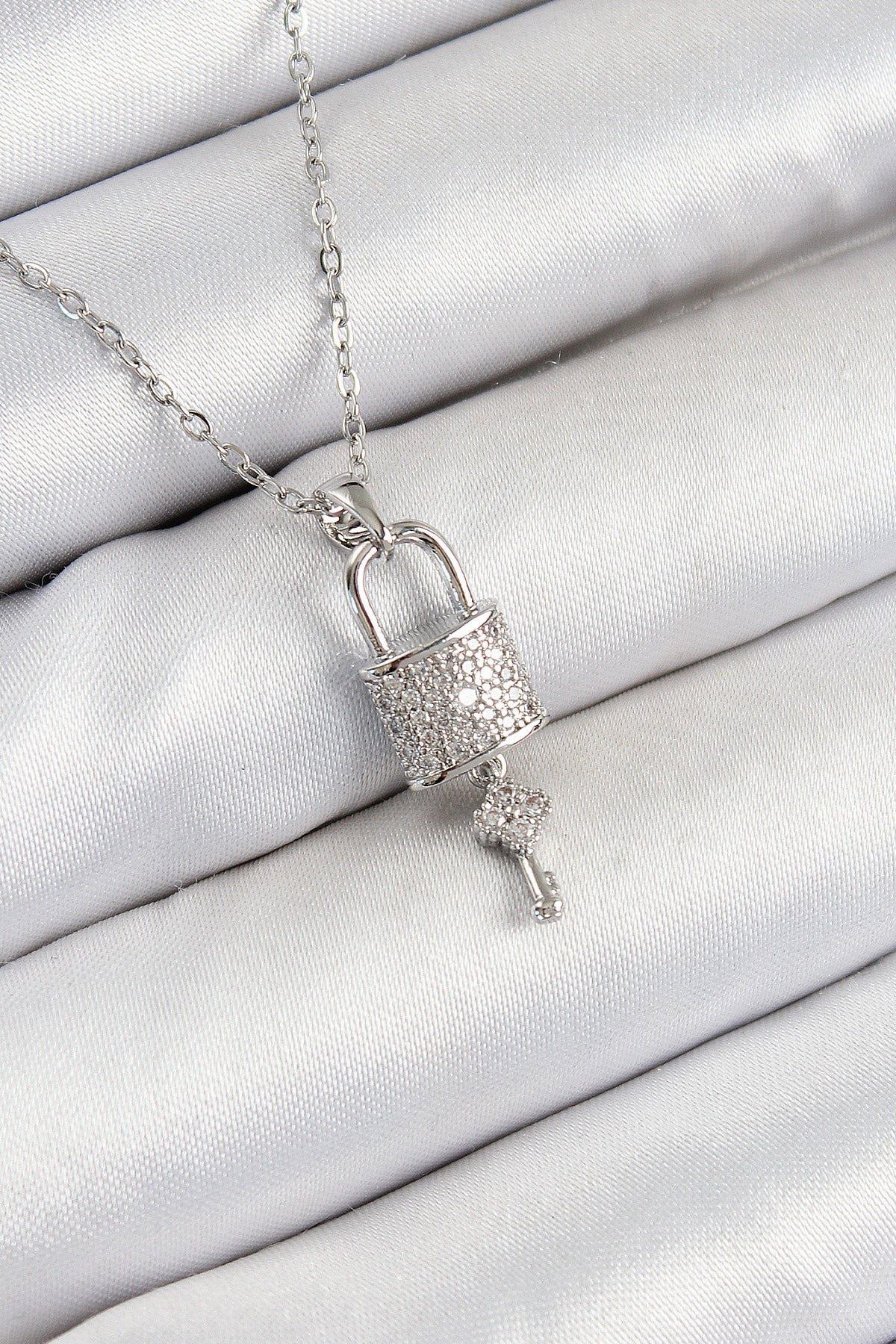 316L Çelik Zirkon Taşlı Kilit Ve Sallantılı Anahtar Model Gümüş Renk Kadın Kolye - BKO10354