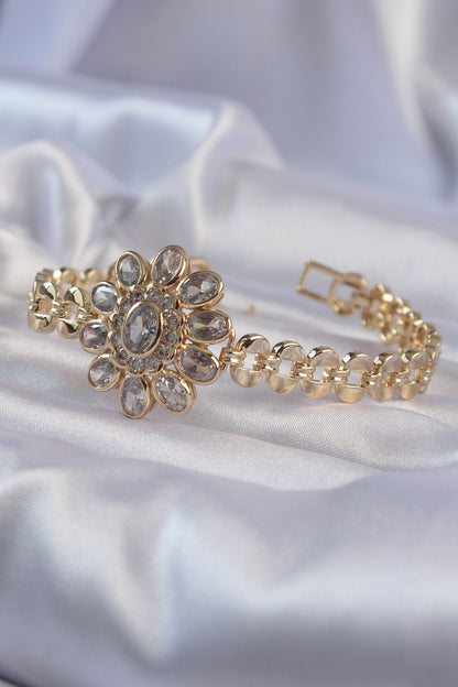 BB6141 - Pirinç Gold Renk İri Zirkon Taşlı Çiçek Figürlü Bileklik