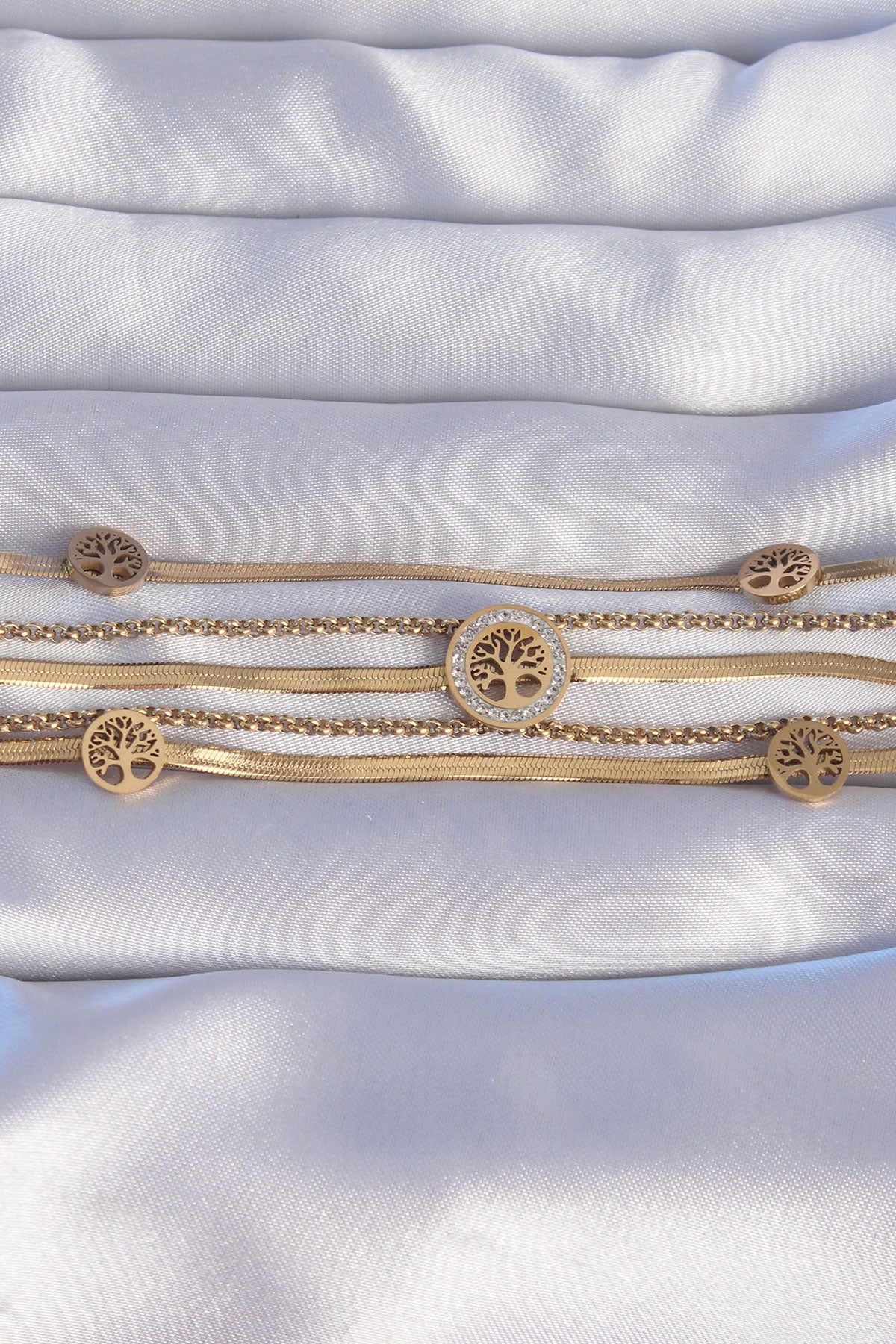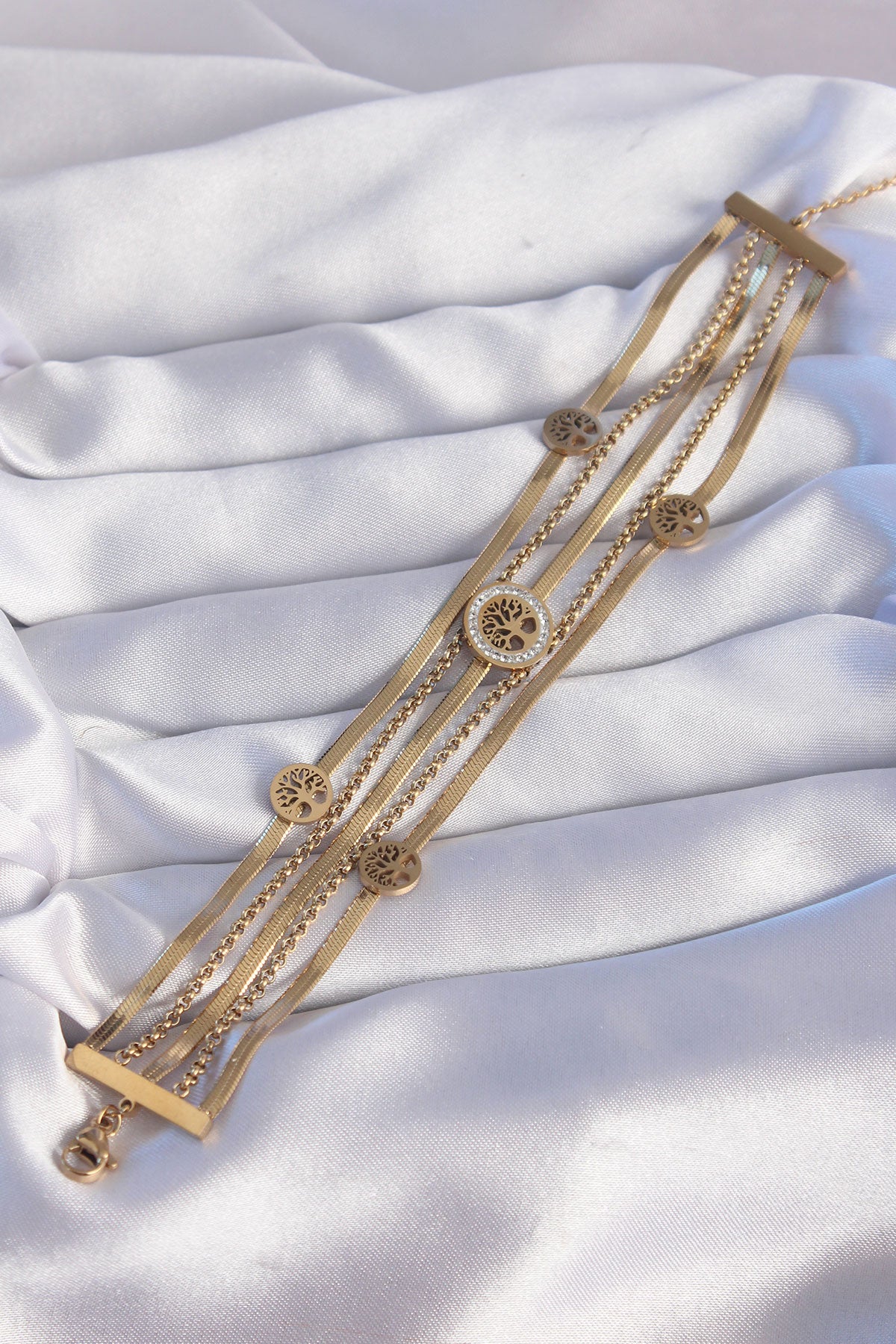 - Ürün Adı: 316L Çelik Gold Renk İtalyan Zincir Detaylı Zirkon Taşlı Yaşam Ağacı Tasarımlı Çoklu Bileklik