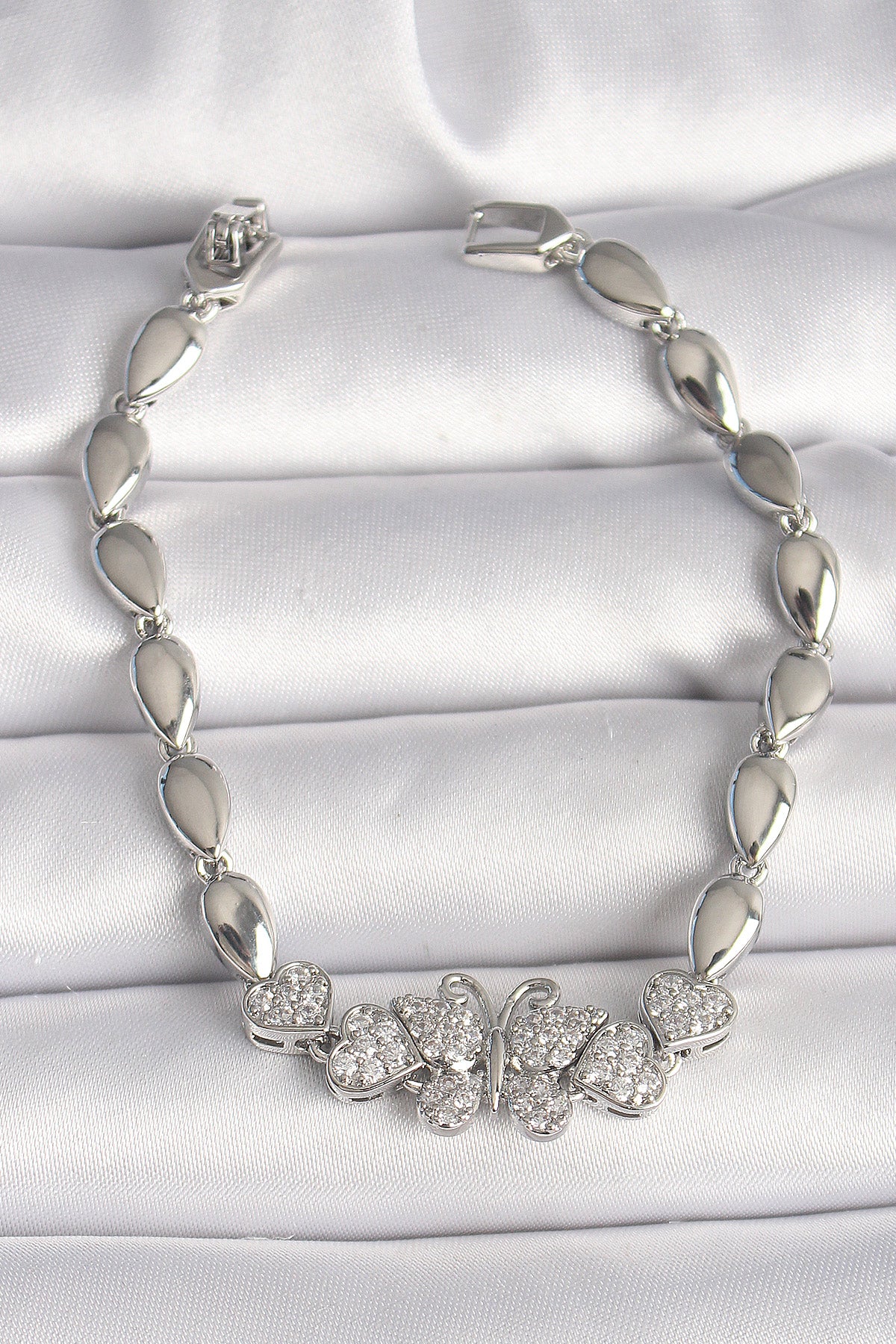 - Ürün Adı: Pirinç Gümüş Renk Zirkon Taşlı Kelebek Figür Damla Zincir Model Kadın Bileklik