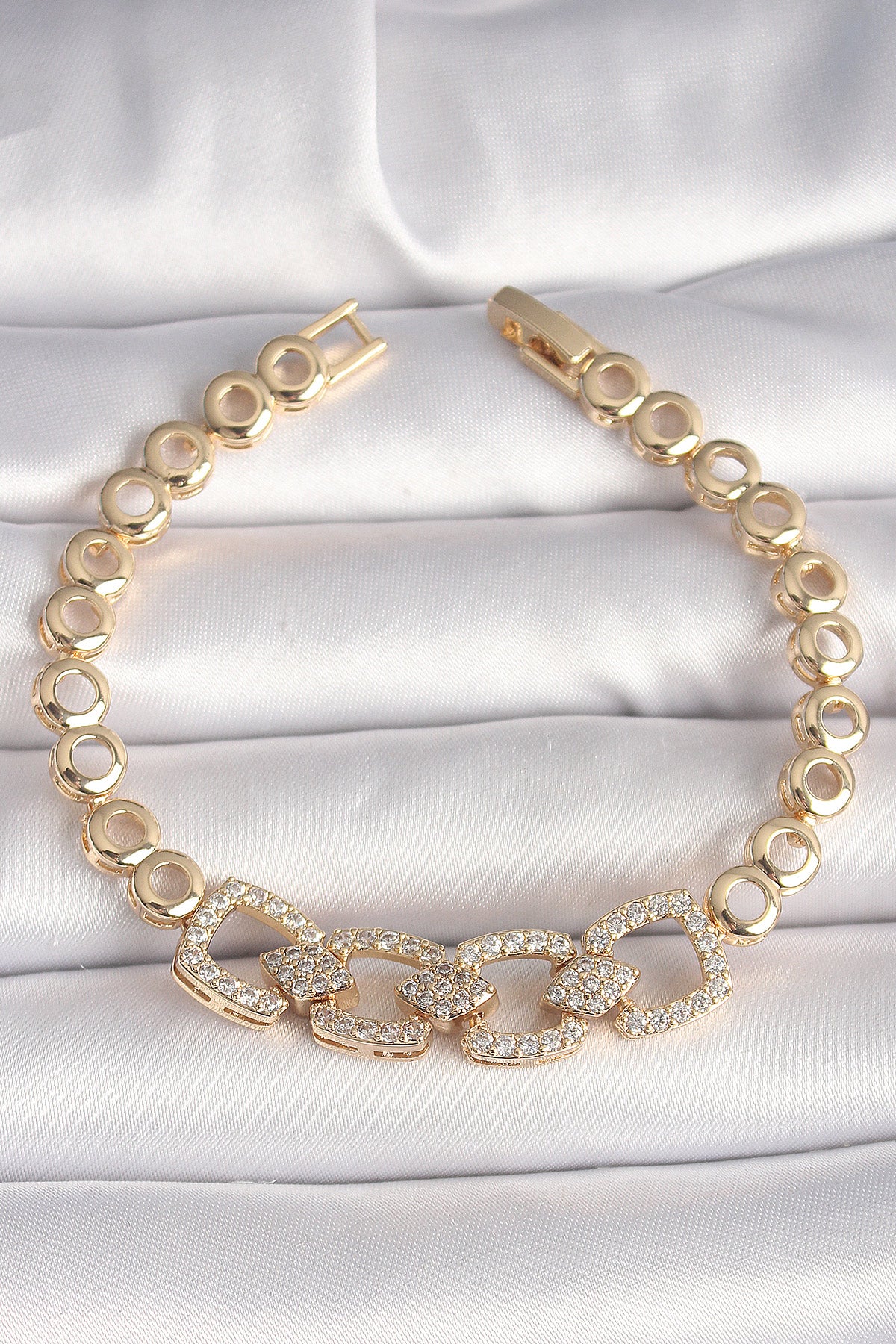 - Ürün Adı: Pirinç Gold Renk Zirkon Taşlı Daire Zincir Model Kadın Bileklik