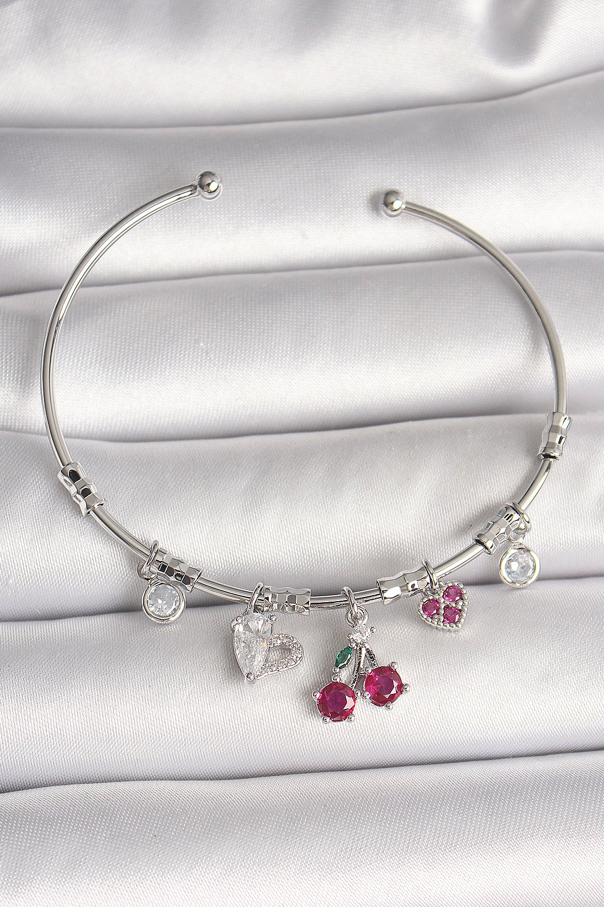BB6901 - Pirinç Gümüş Renk Sallantı Kiraz Figür Kalp Detay Charm Kadın Bileklik