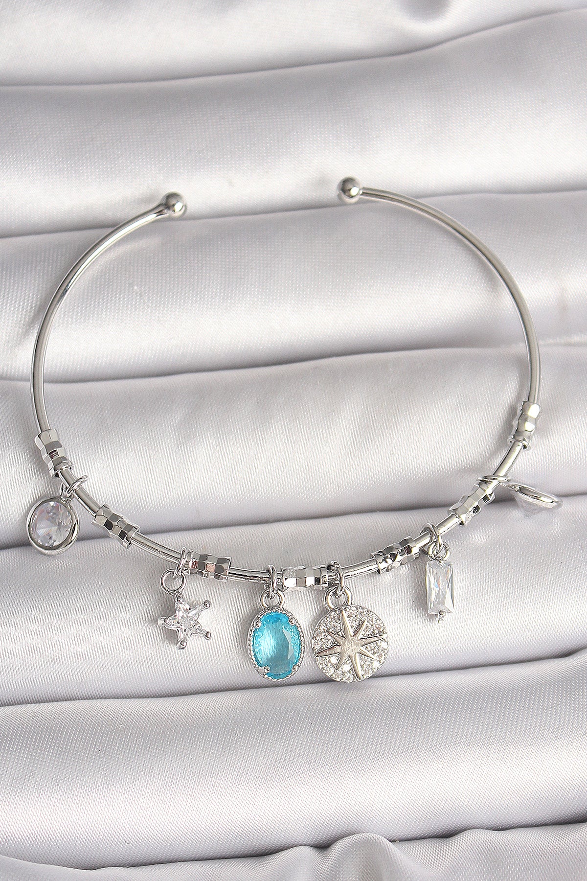 BB6902 - Pirinç Gümüş Renk Sallantı Pusula Figür Kalp Detay Charm Kadın Bileklik
