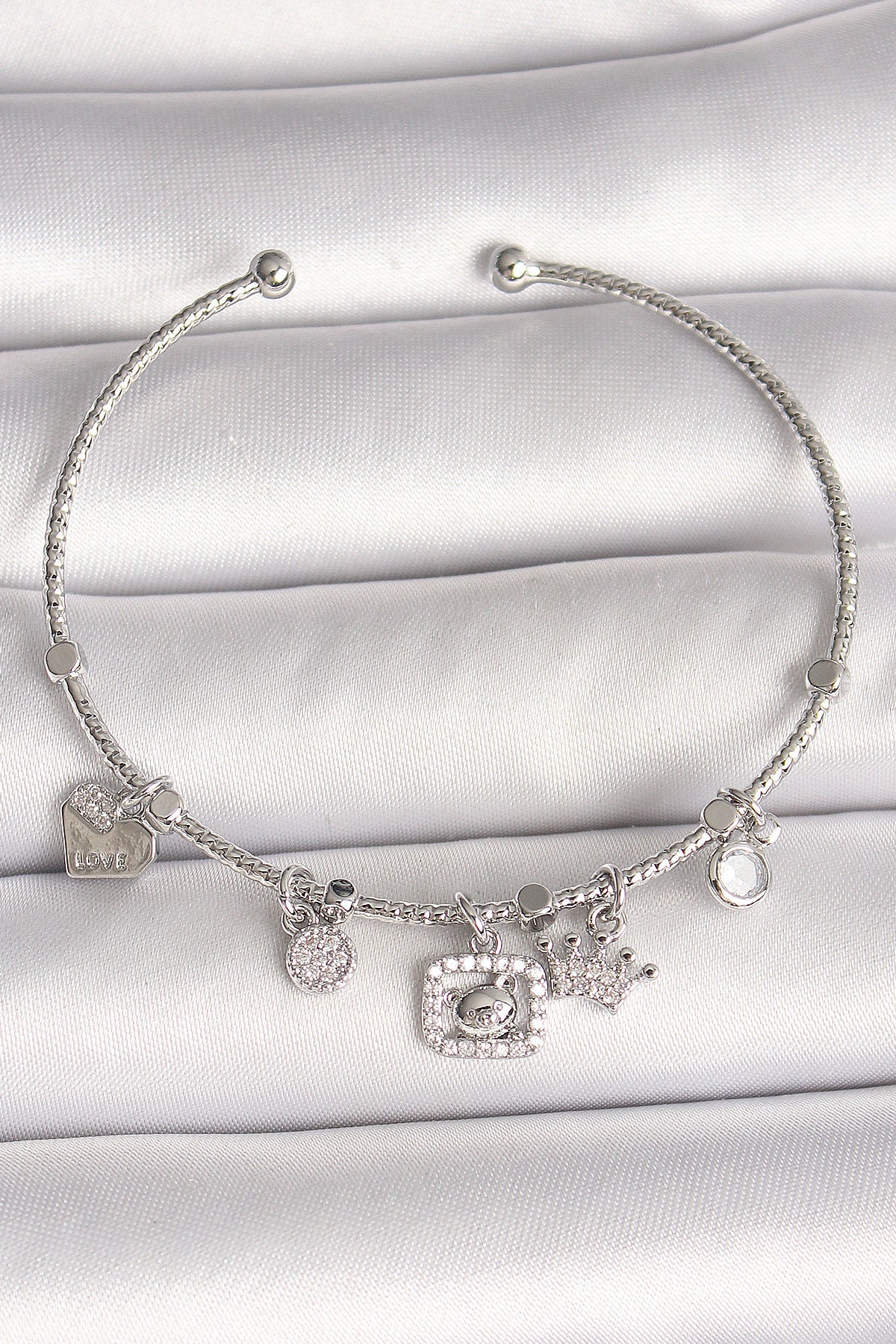 BB6907 - Pirinç Gümüş Renk Sallantı Zirkon Taşlı Ayıcık Figür Taç Detay Charm Kadın Bileklik