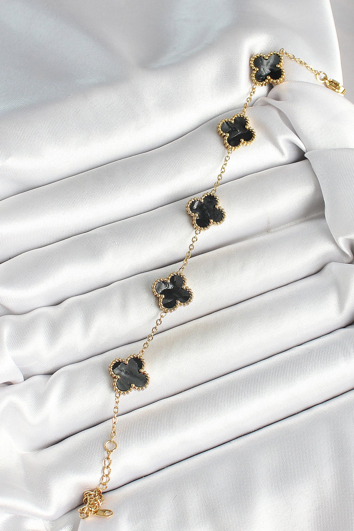 BB6969 - 316L Çelik Sedefli Siyah Gold Renk Yonca Kadın Bileklik