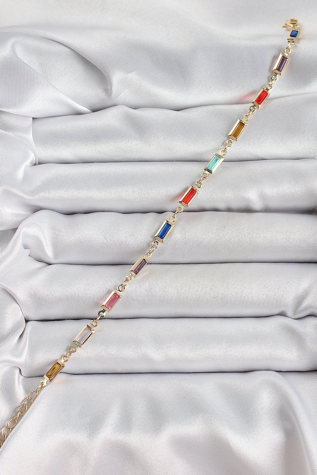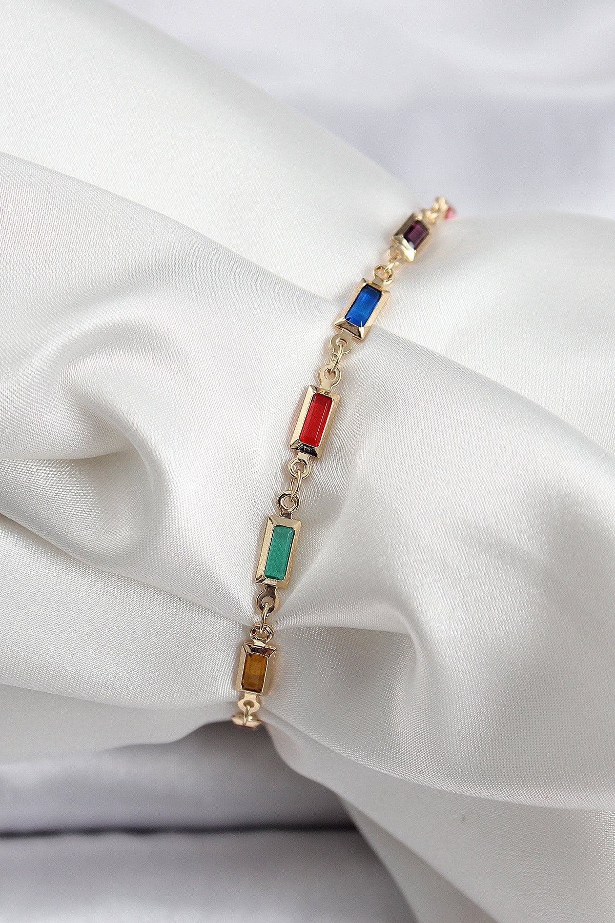 - Ürün Adı: Pirinç Gold Renk Karışık Renkli Kare Zirkon Taşlı Kadın Bileklik