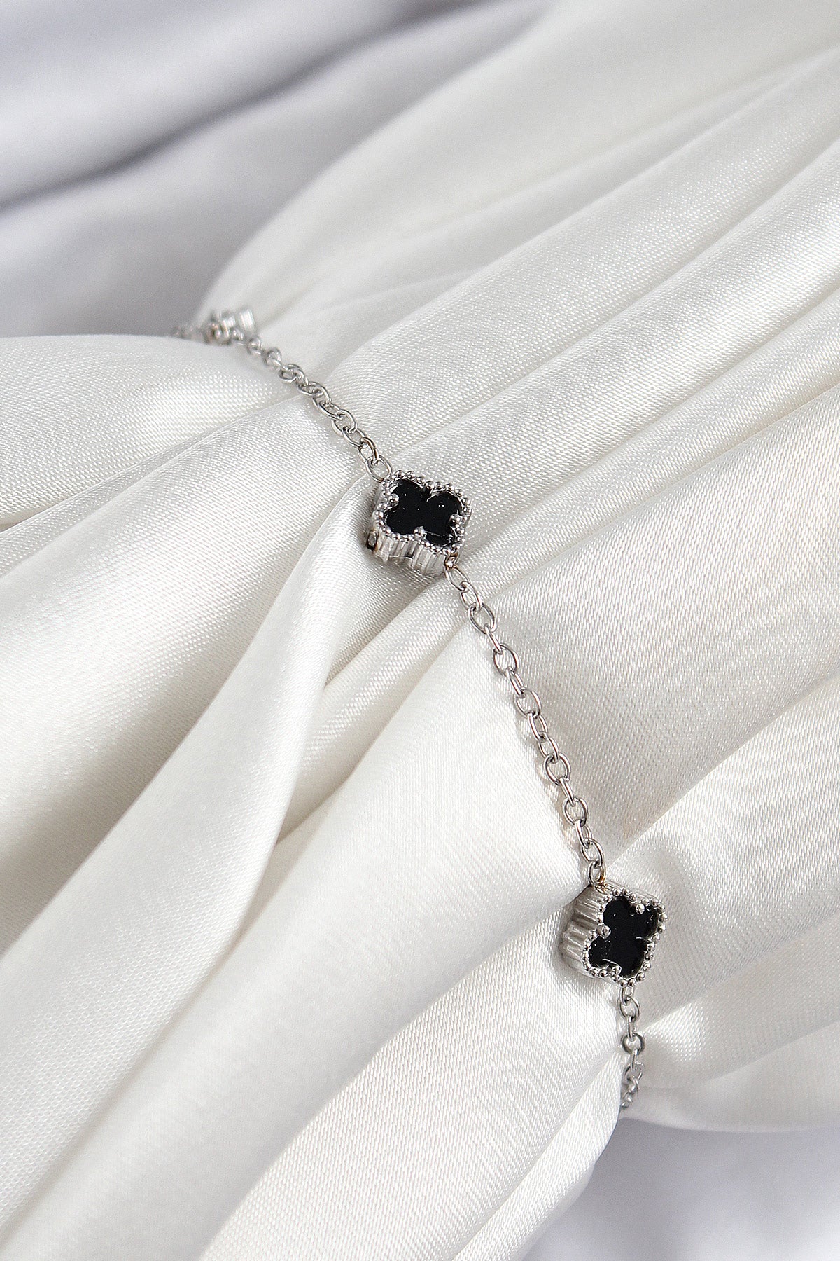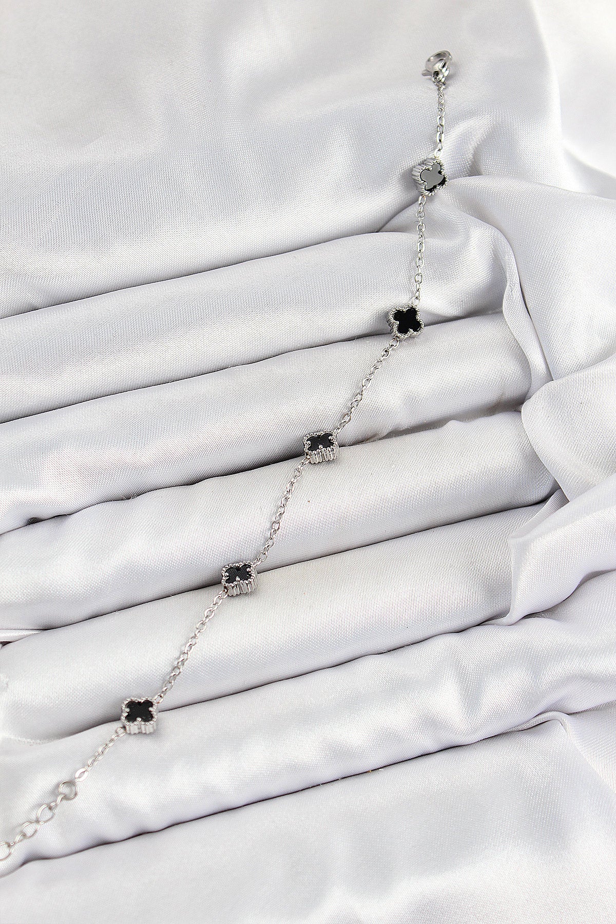 - Ürün Adı: 316L Çelik Siyah Sedef Yonca Model Gümüş Renk Kadın Bileklik