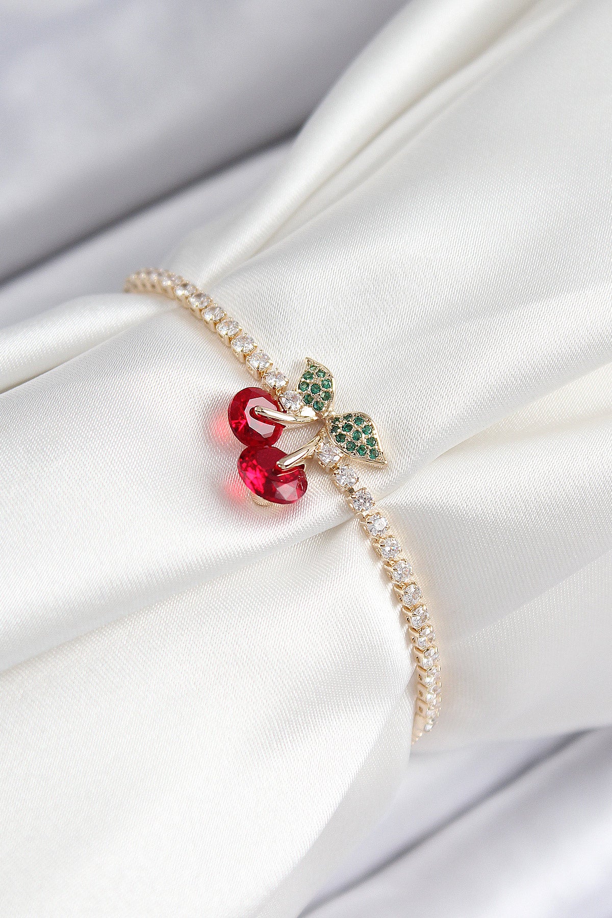 - Ürün Adı: Pirinç Zirkon Taşlı Kiraz Model Gold Renk Asansörlü Kadın Bileklik