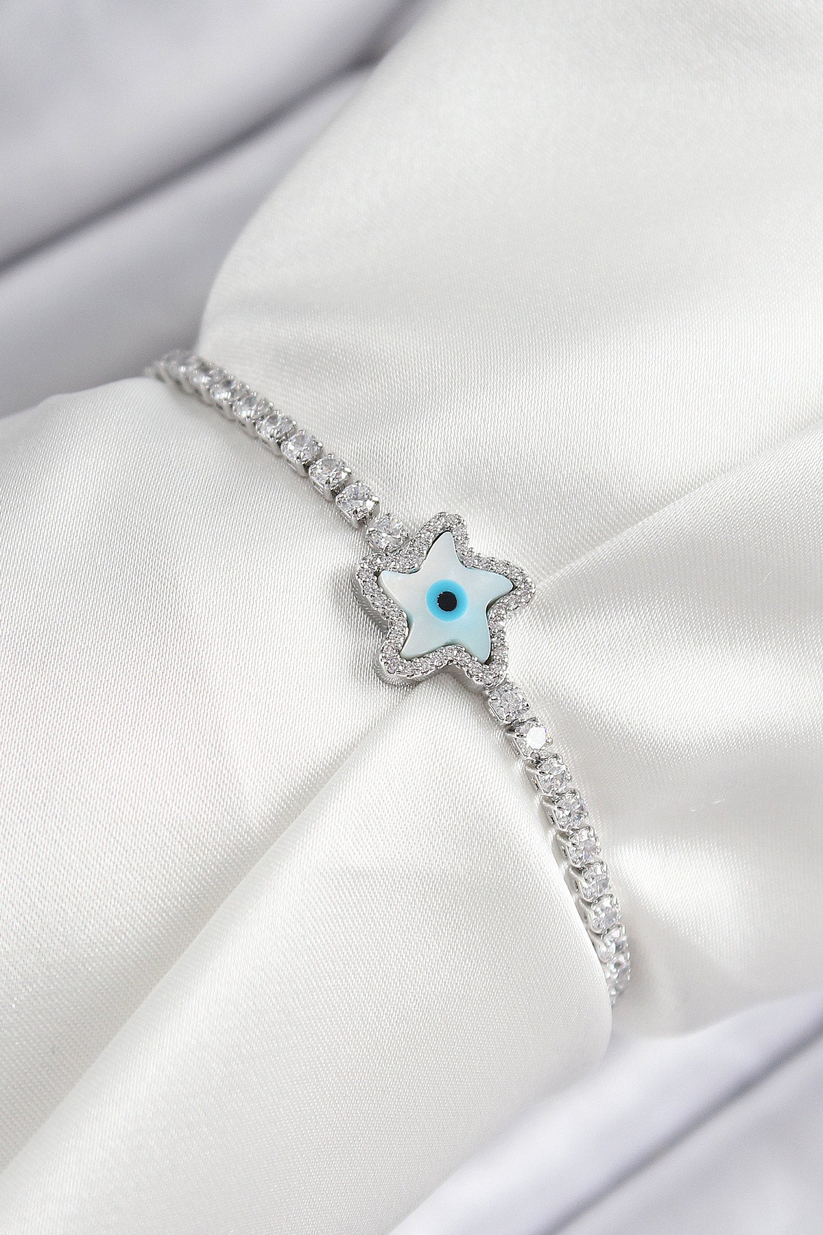 - Ürün Adı: Pirinç Zirkon Taşlı Nazar Yıldız Model Gümüş Renk Asansörlü Kadın Bileklik