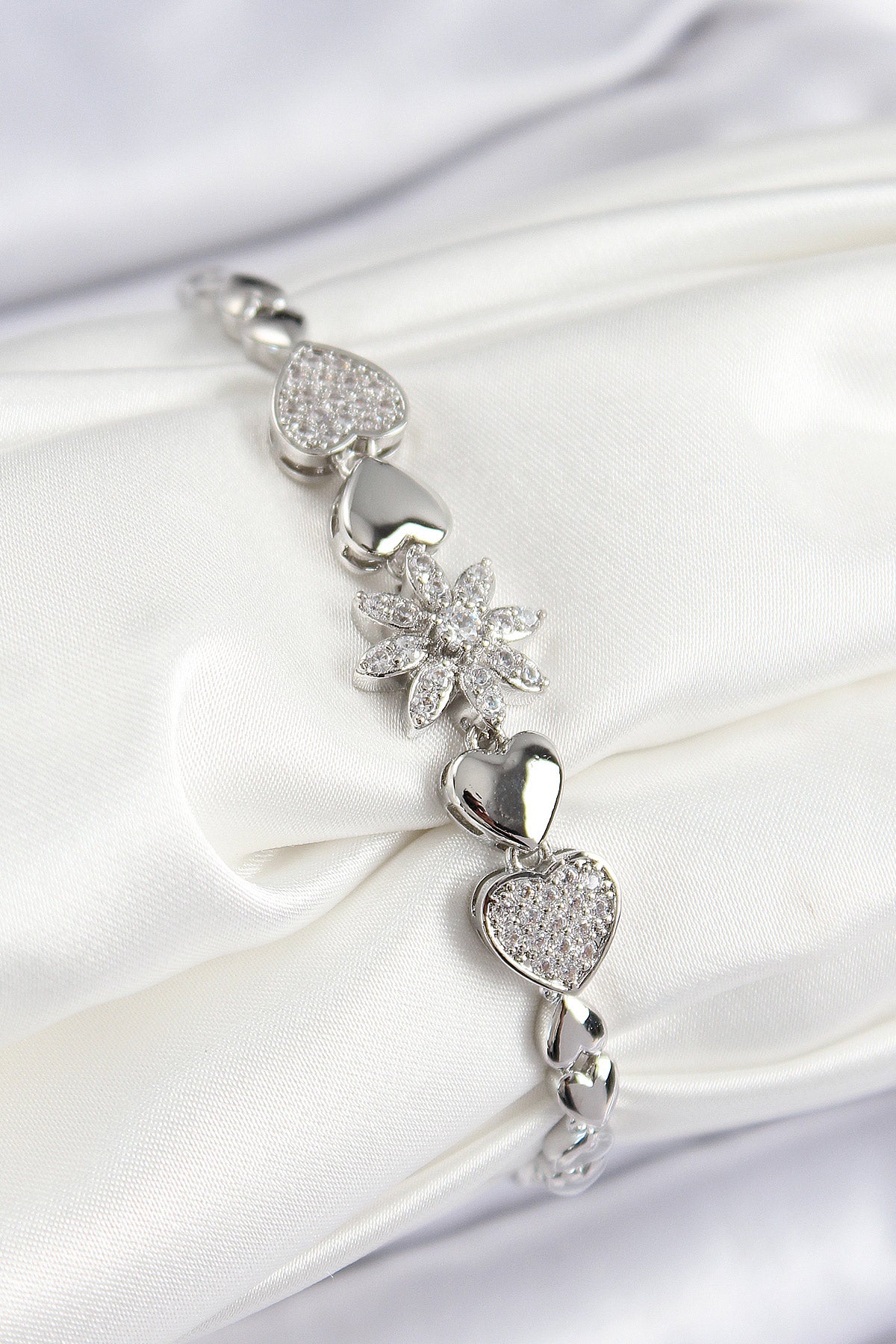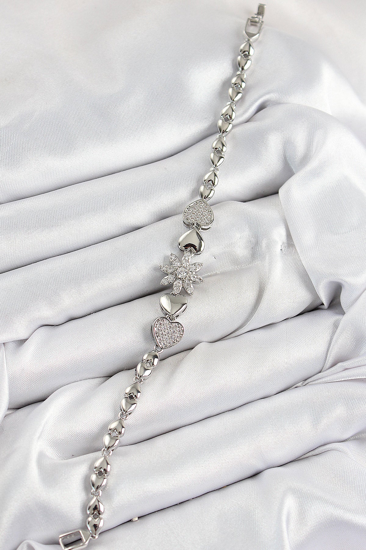 - Ürün Adı: Pirinç Zirkon Taşlı Kalp Detaylı Çiçek Model Gümüş Renk Kadın Bileklik