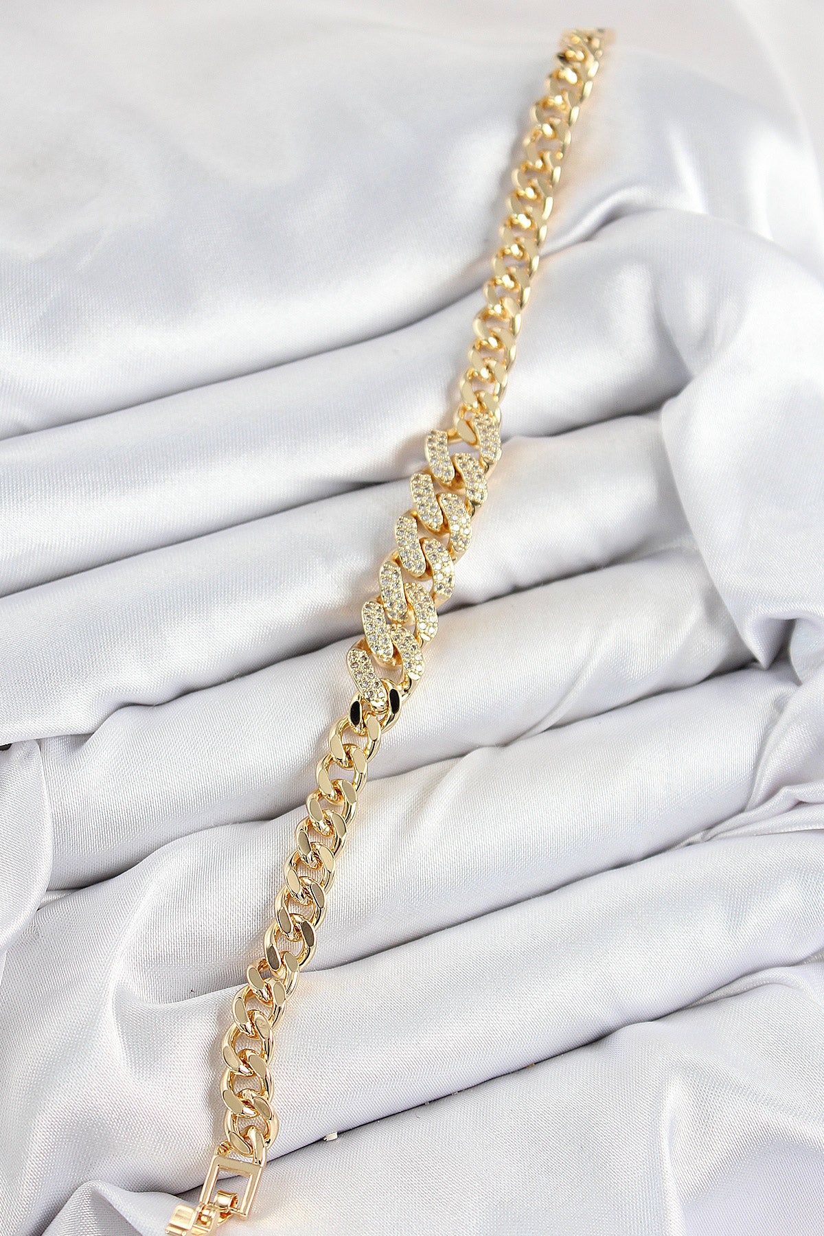 - Ürün Adı: Pirinç Zirkon Taşlı Küba Zincir Model Gold Renk Kadın Bileklik