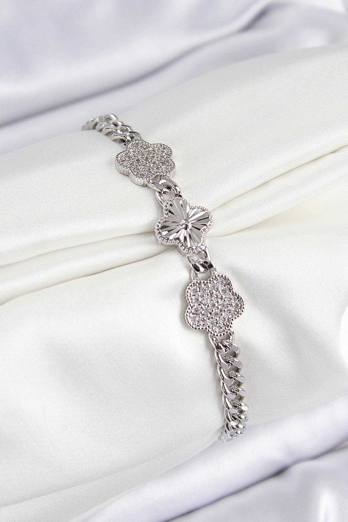 - Ürün Adı: Pirinç Zirkon Taşlı Yonca Model Gümüş Renk Kadın Bileklik