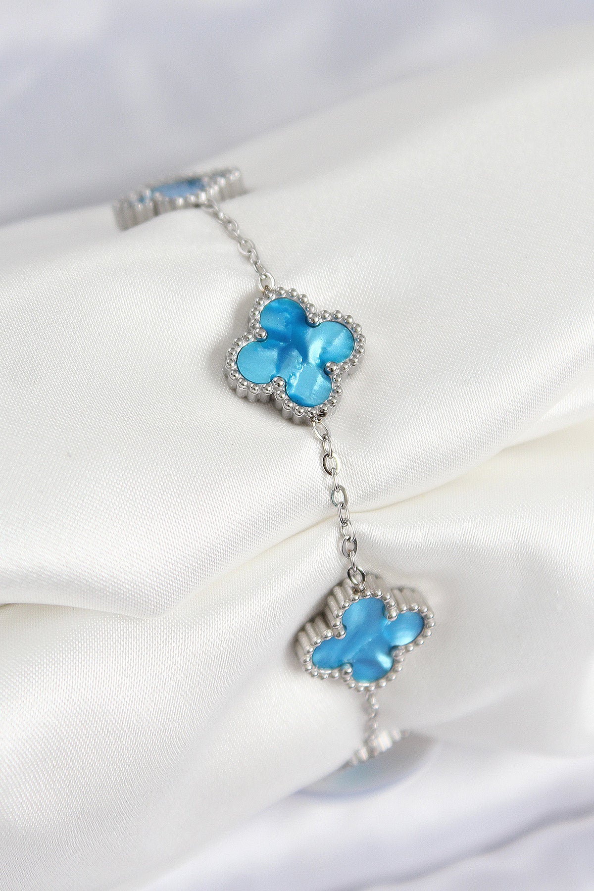 - Ürün Adı: 316L Çelik Sedefli Gökyüzü Mavisi Gümüş Renk Yonca Kadın Bileklik