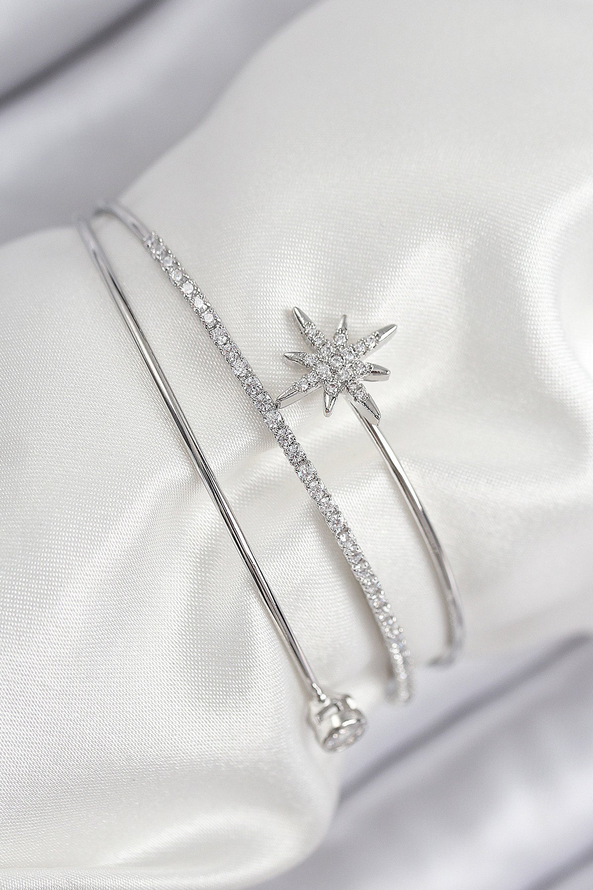 BB7888 - Pirinç Zirkon Taşlı Kutup Yıldızı Model Gümüş Renk Kadın Bileklik