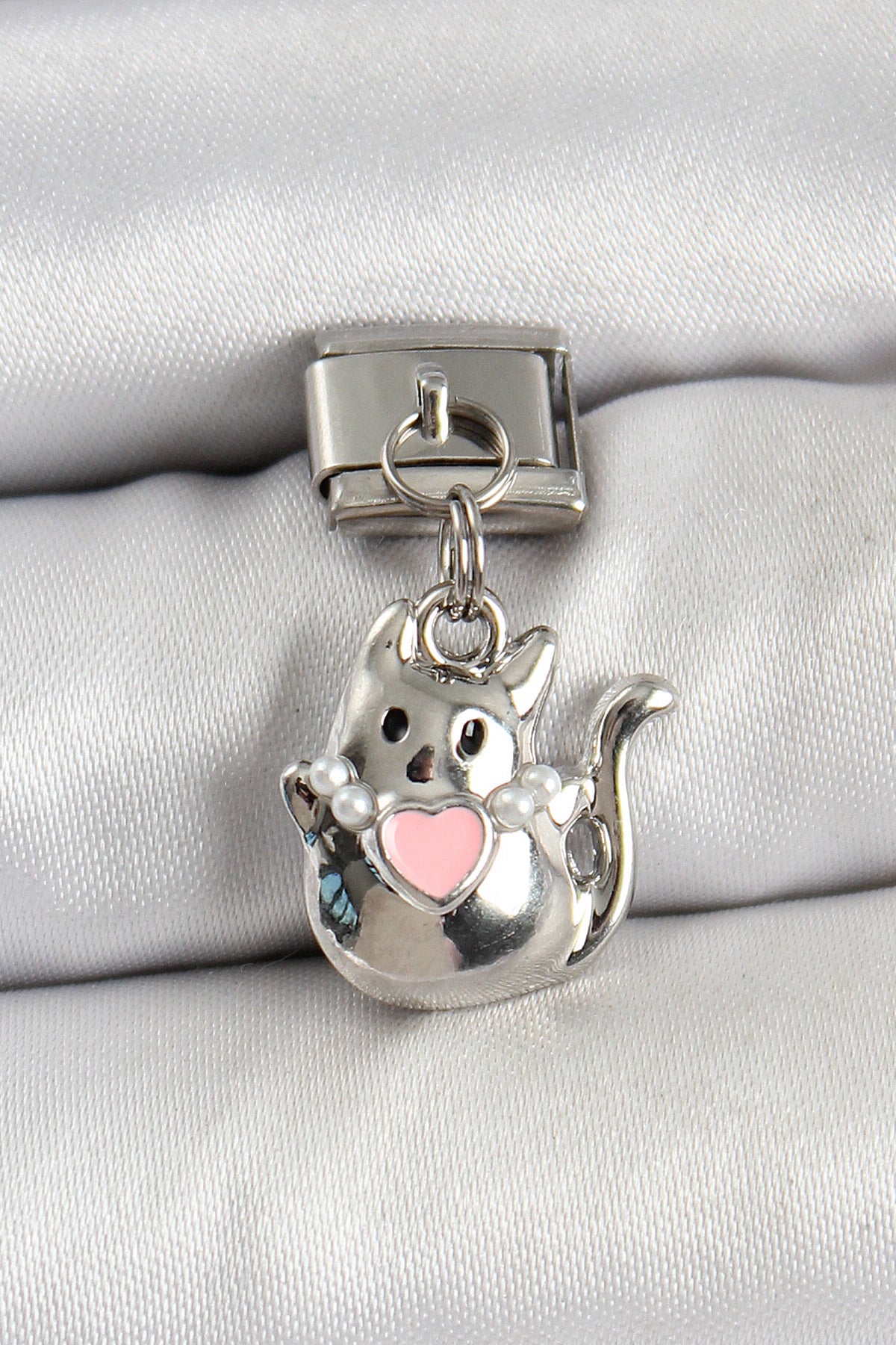 BC1460 - 316L Çelik Sallantılı Kalp Detaylı Kedi Model Gümüş Renk Nomination Charm