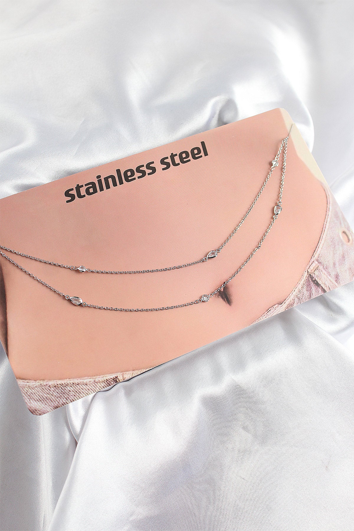 BKGZ10341 - 316L Çelik Zirkon Taşlı Damla Model Gümüş Renk Göbek Bel Zinciri