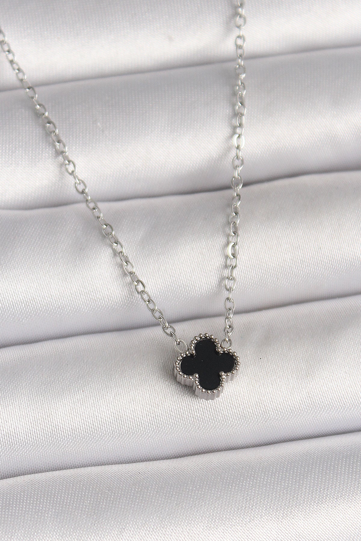 - Ürün Adı: 316L Çelik Gümüş Renk Siyah Yonca Model Kadın Kolye