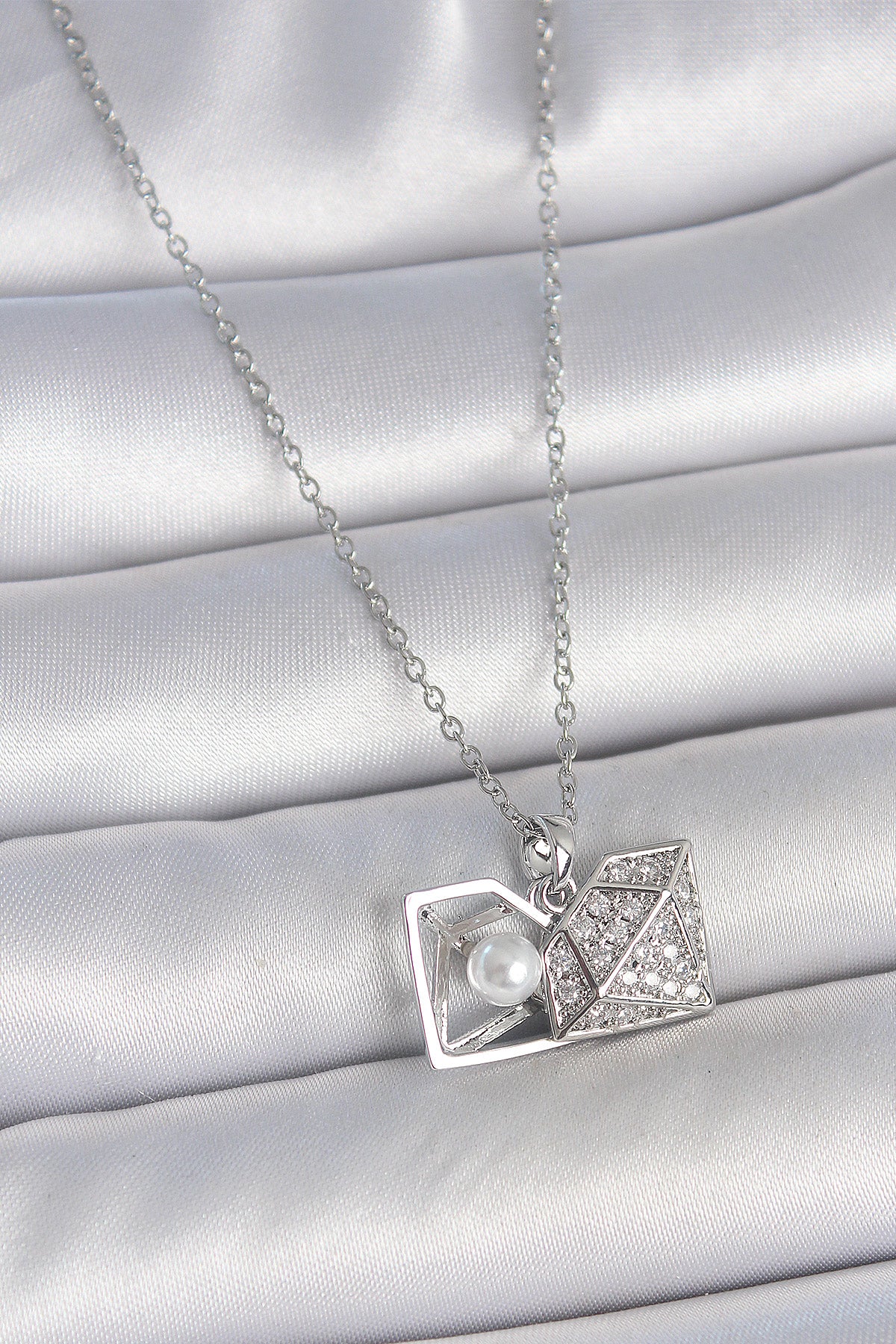 BKO10048 - 316L Çelik Gümüş Renk Zincir Zirkon Taşlı İncili Açılır Elmas Model Kadın Kolye